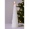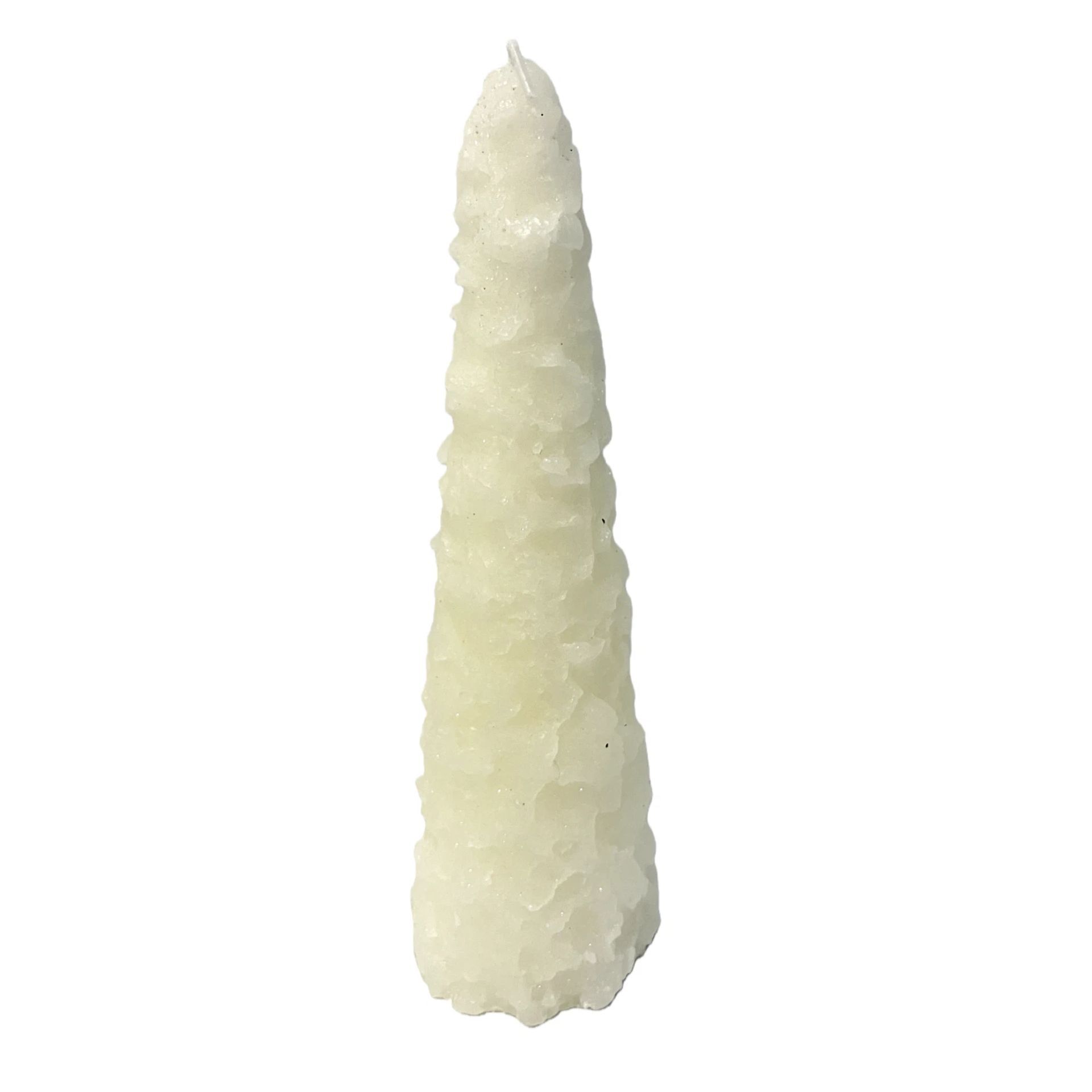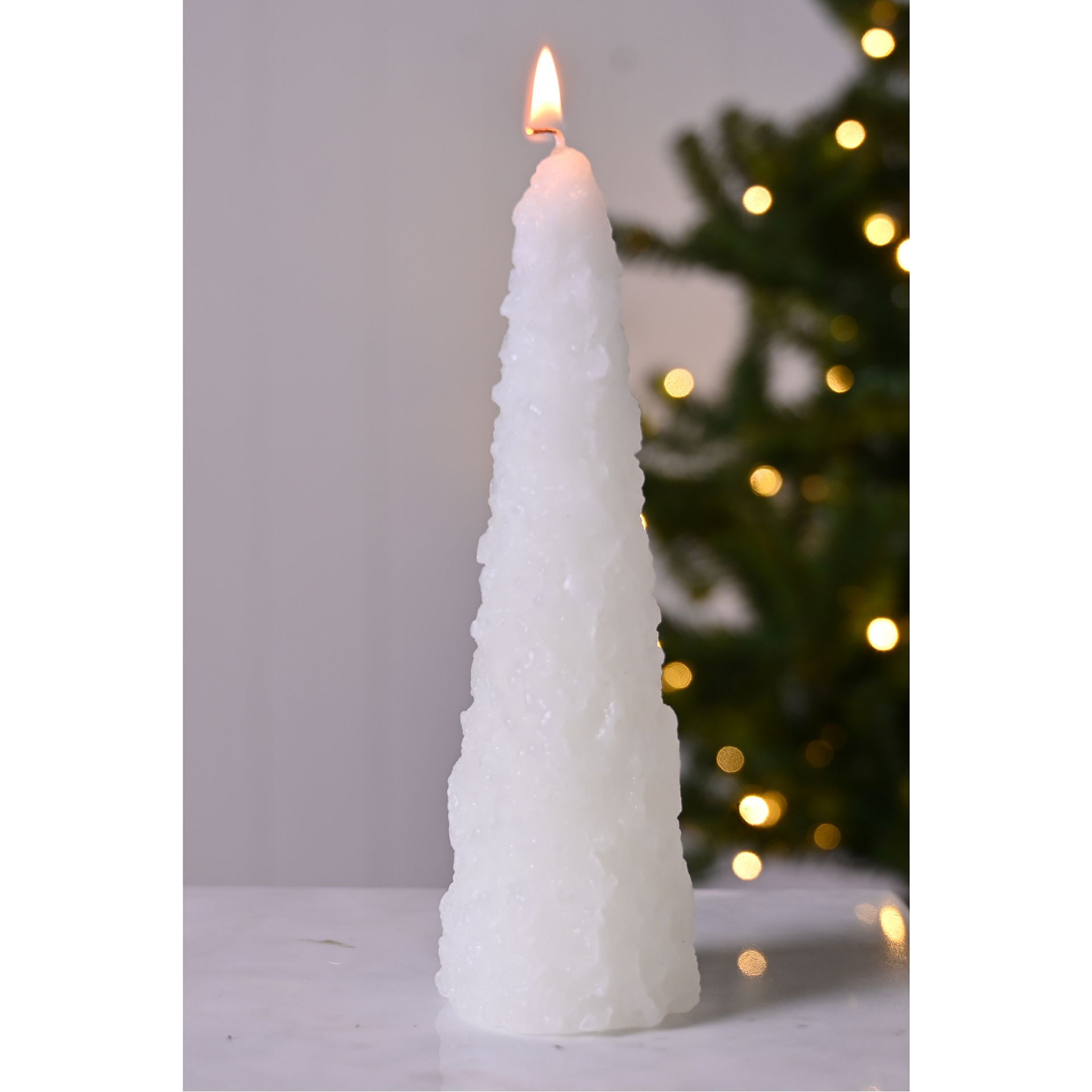 A tall, white, tree-shaped candle is lit, with frosted finish echoes the gentle curves of freshly fallen snow. The design brings a subtle touch of festive elegance, perfect for creating a warm, inviting atmosphere.