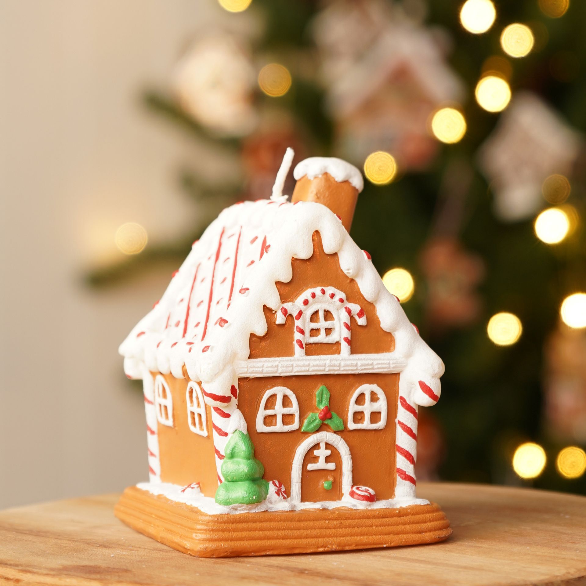 A candle shaped as a gingerbread house with a snowy roof, decorated with candy canes and a small Christmas tree in the foreground, brings a nostalgic warmth to seasonal settings.