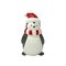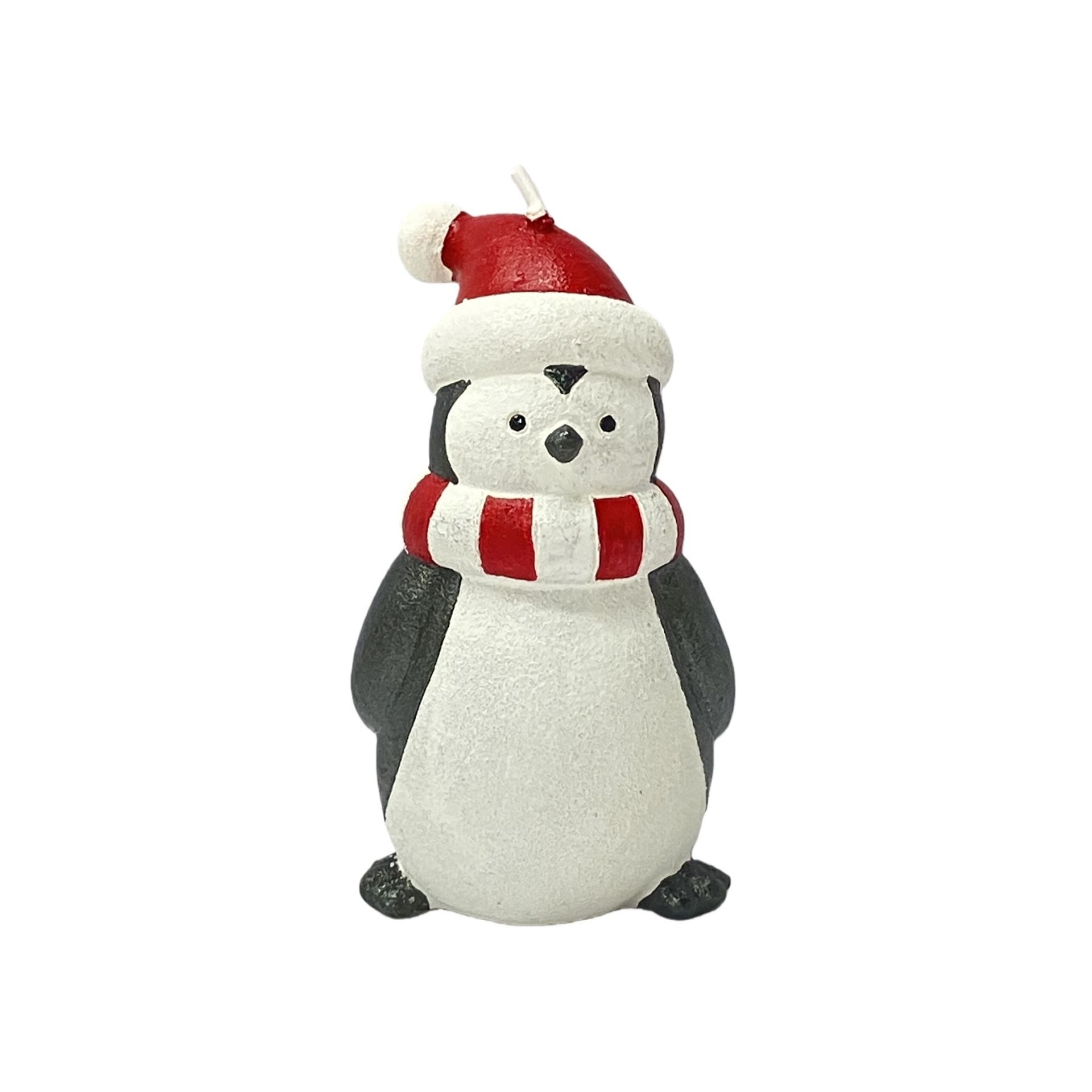 A small, adorable penguin-shaped candle with a red scarf and Santa hat features gentle detailing and a smooth wax finish.