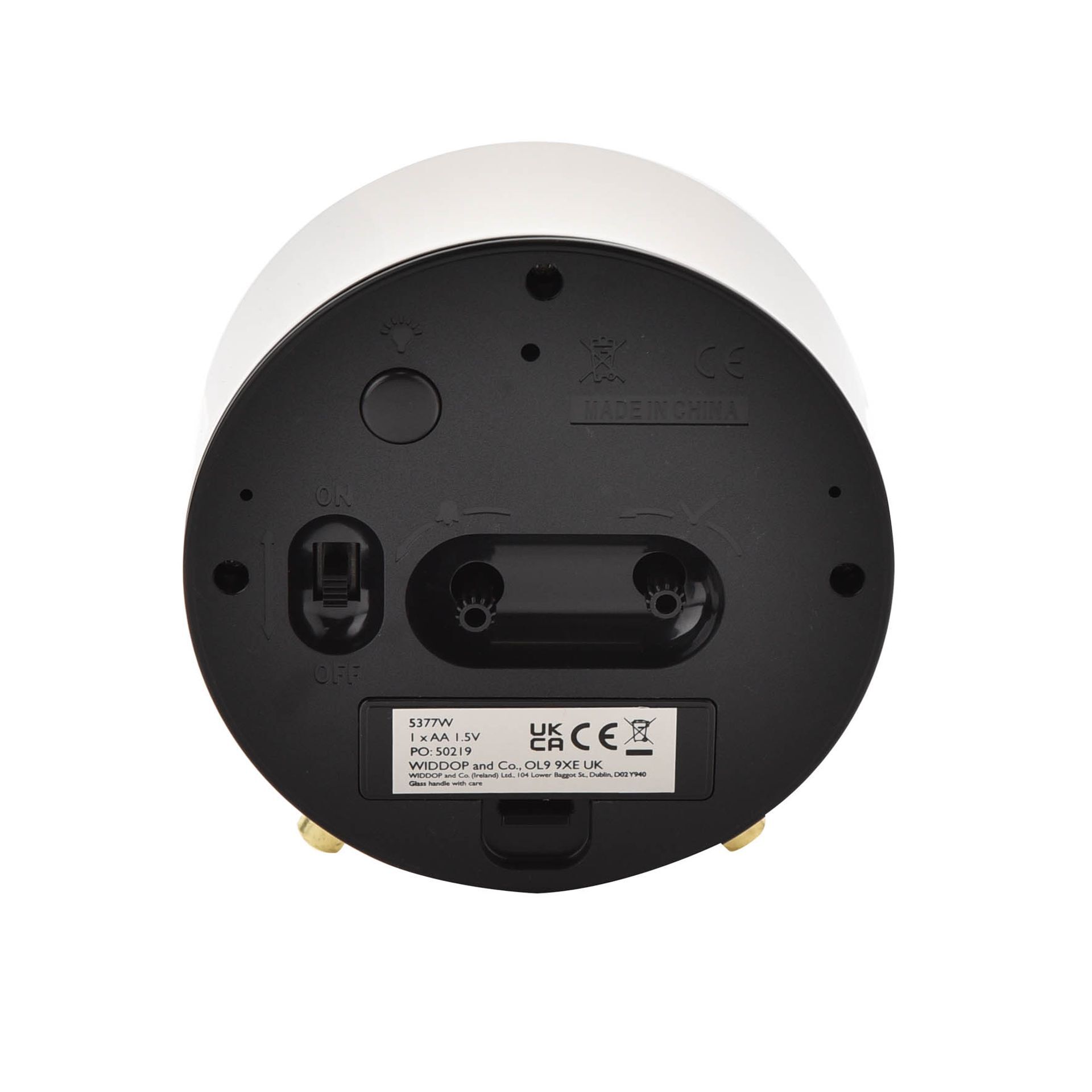 A white, round alarm clock from WILLIAM WIDDOP®.
