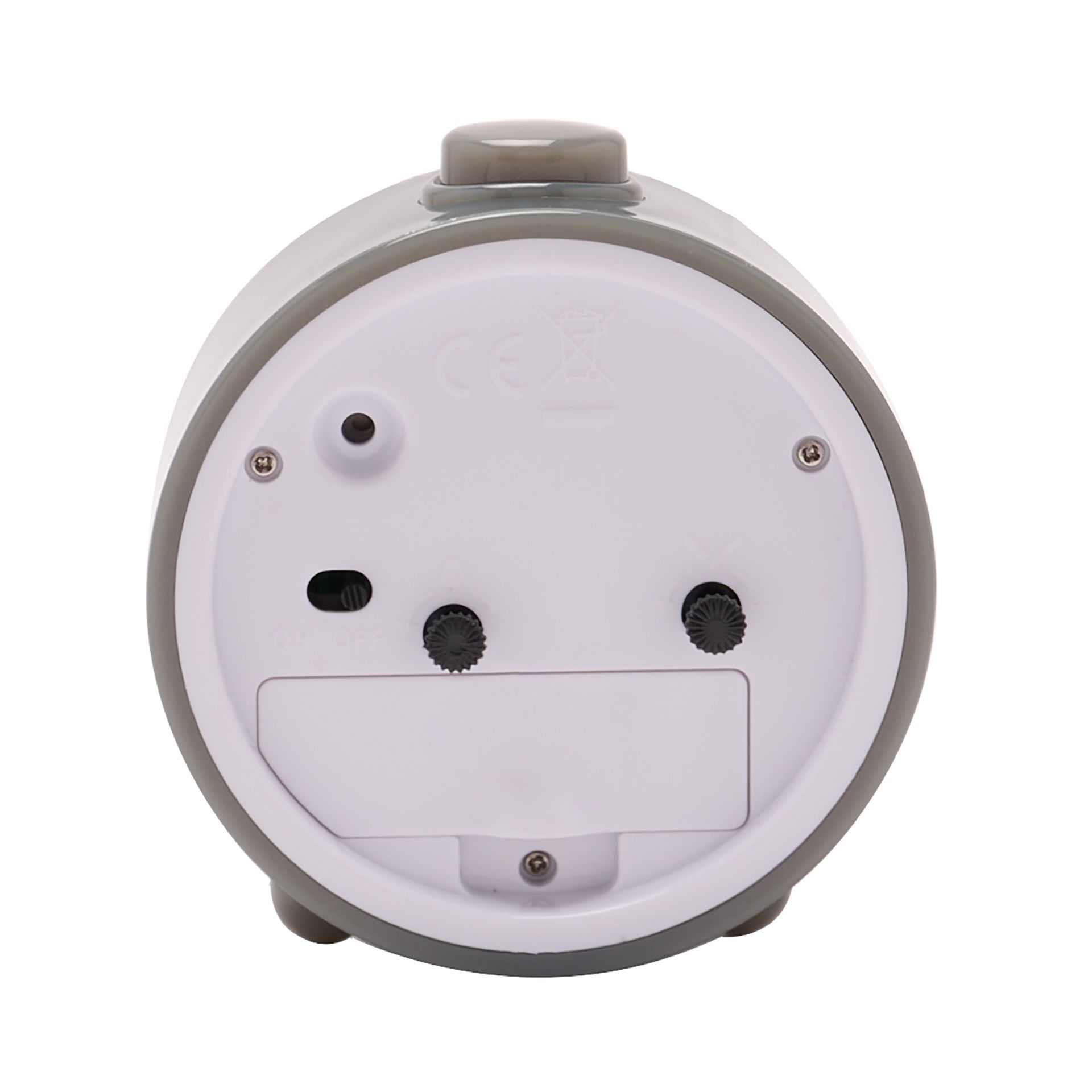 The round alarm clock showcases a grey vintage finish, matching feet, and white clock face. It is completed by black clock hands, Arabic dial, snooze function and sweep movement.