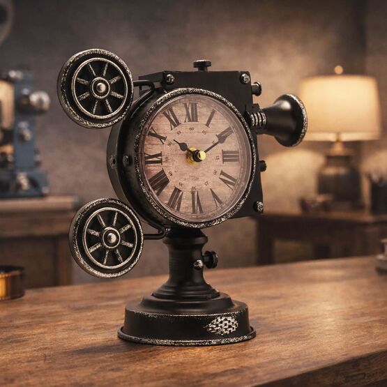 Featuring twin reel detailing, a projector lens and an aged finish, it captures the look of traditional film equipment while incorporating a clear clock face into the centre. The freestanding base adds stability and presence, making it ideal for shelves, desks or mantelpieces.