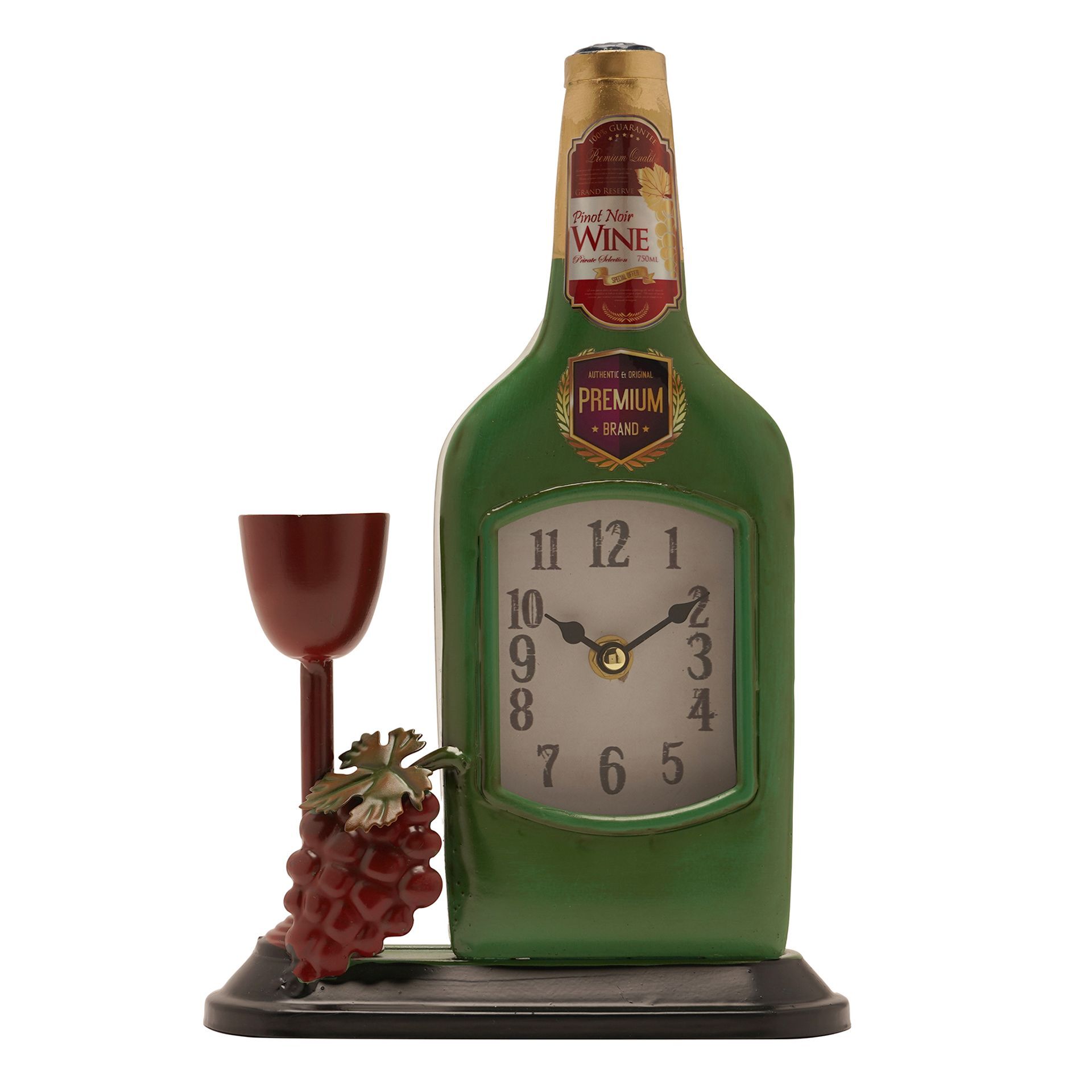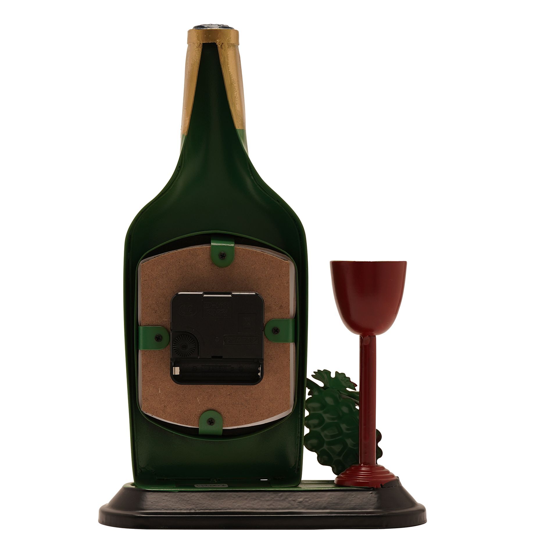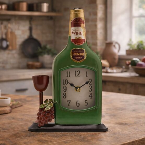 The Hometime Metal Mantle Clock – Wine brings a playful, bar-inspired touch to timekeeping. Designed in the shape of a wine bottle, this metal clock combines novelty styling with practical function, making it a standout piece for kitchens, dining areas or home bars. Featuring detailed elements including a bottle label, grape cluster and a small wine glass accent, it captures the charm of wine culture while incorporating a clear clock face into the centre. The freestanding base ensures stability and display appeal on shelves or countertops. Part of the Hometime collection, this mantle clock is perfect for gifting or for adding a fun, themed accent to the home.