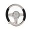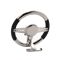 The clock design showcases significant attention to detail. The intricate die-cast chrome finish wheel features glossy black dimpled leather grip details and a central Arabic dial clock face.