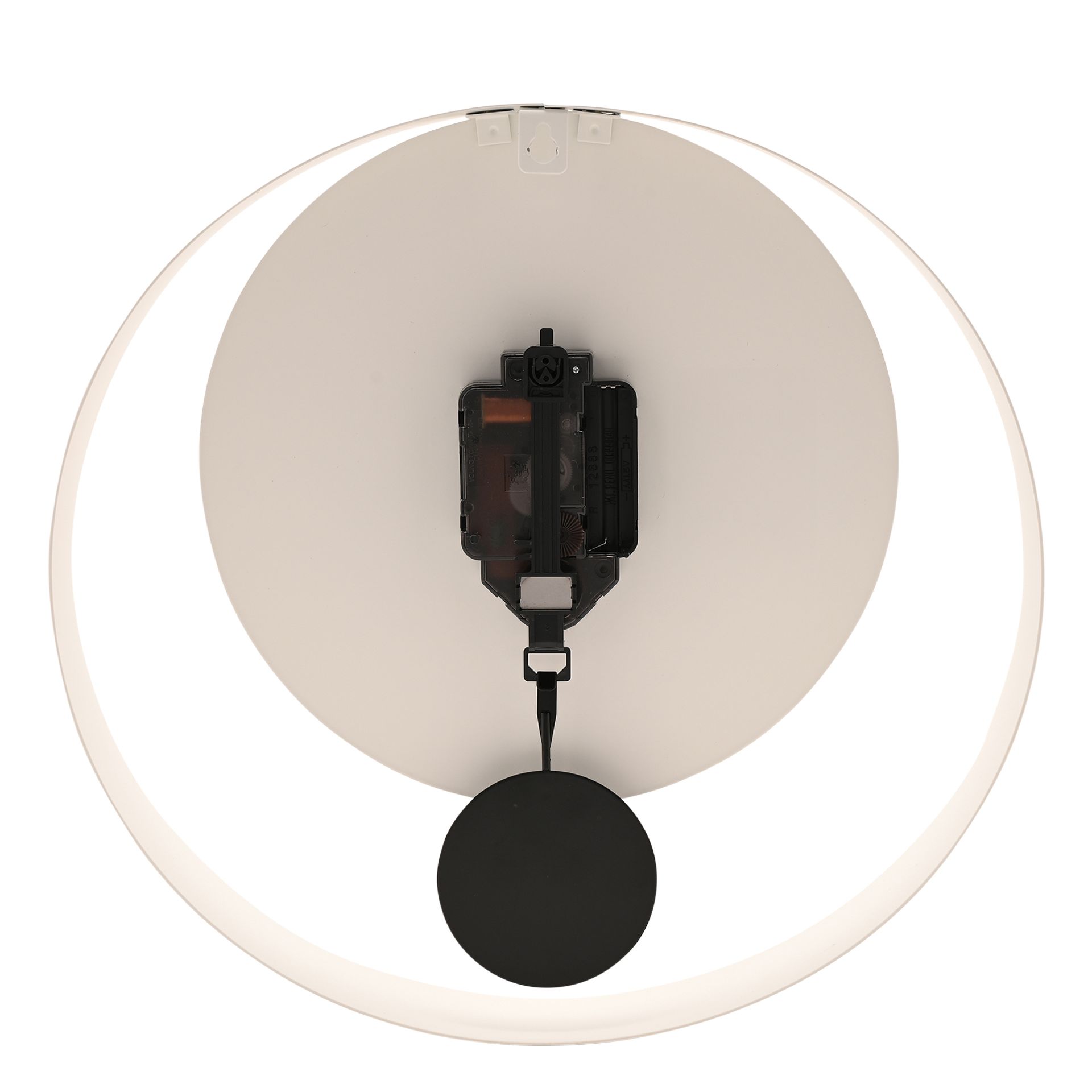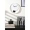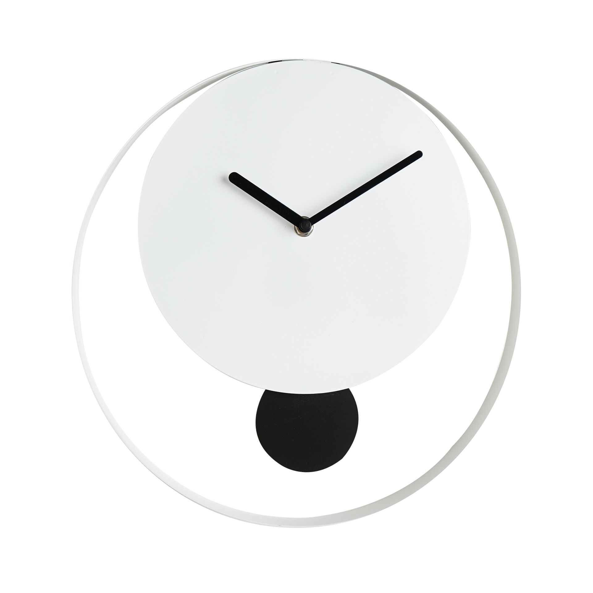 Its sleek white face, contrasted with bold black hands and pendulum, makes it a stylish addition to any modern home or office.