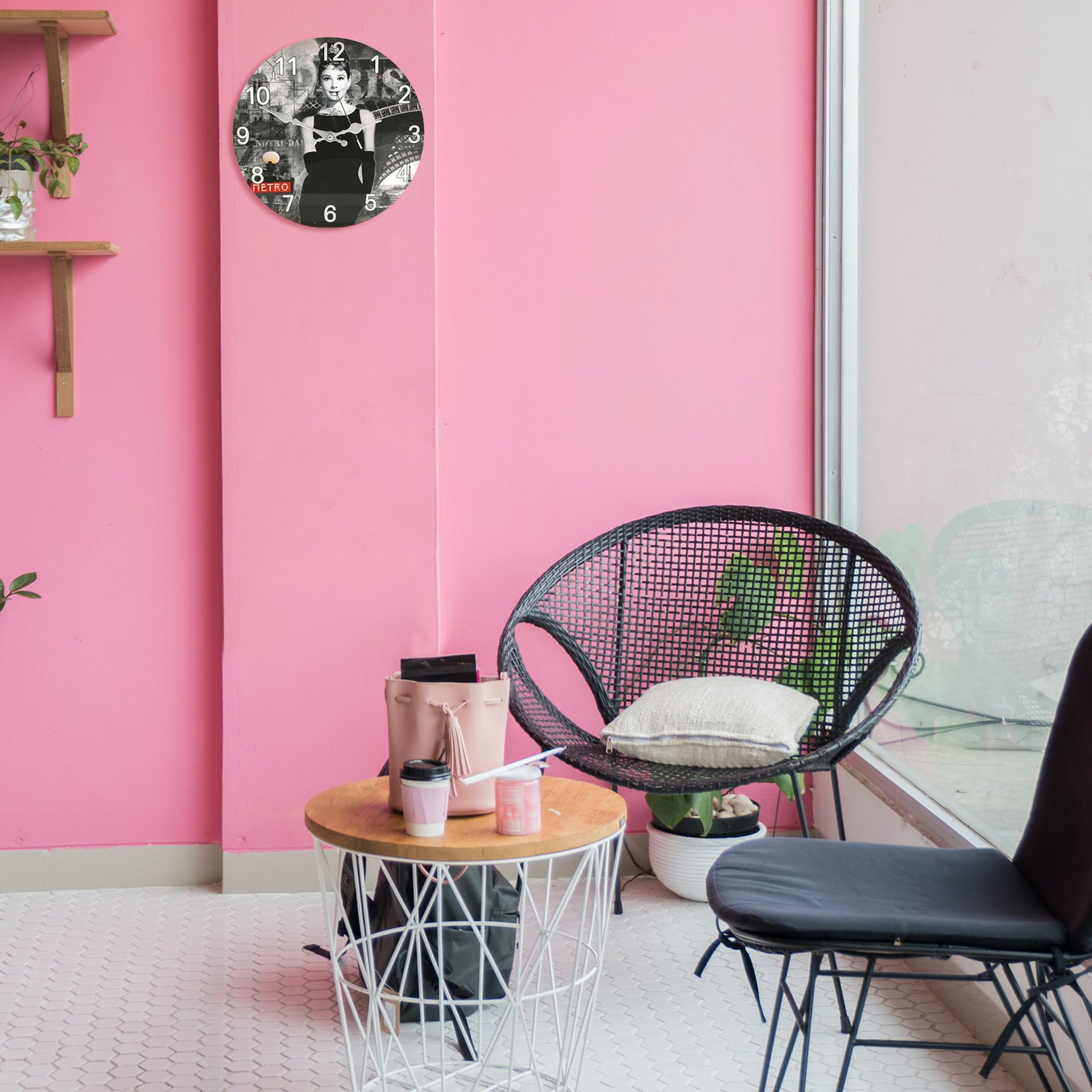 A glass wall clock from Juliana, featuring a collage of Parisien landmarks behind a portrait of the American actress from the iconic Breakfast at Tiffany's. A fantastic addition to any home, perfect for a fan of classic Hollywood.