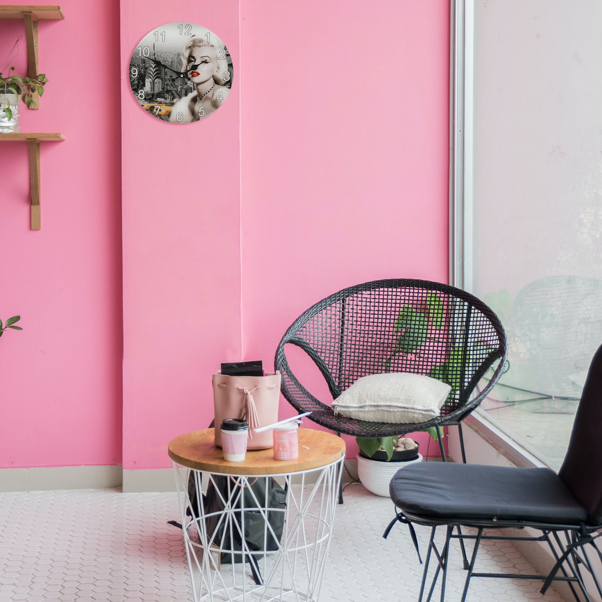 A glass wall clock from Juliana, featuring a spectacular image of the New York skyline behind a portrait. A fantastic addition to any home, perfect for a fan of classic Hollywood and Americana.