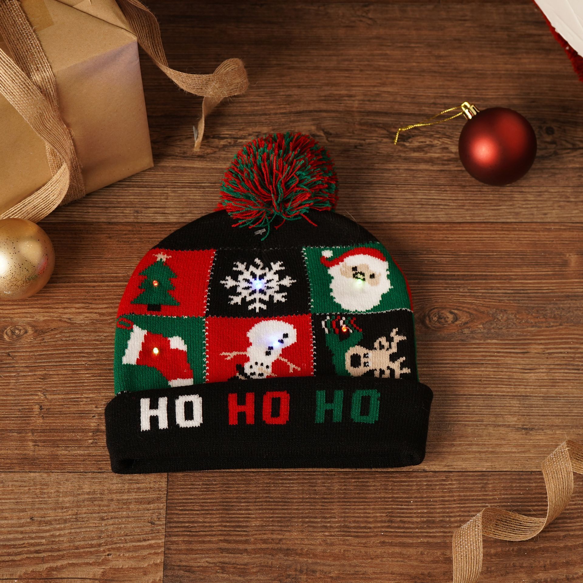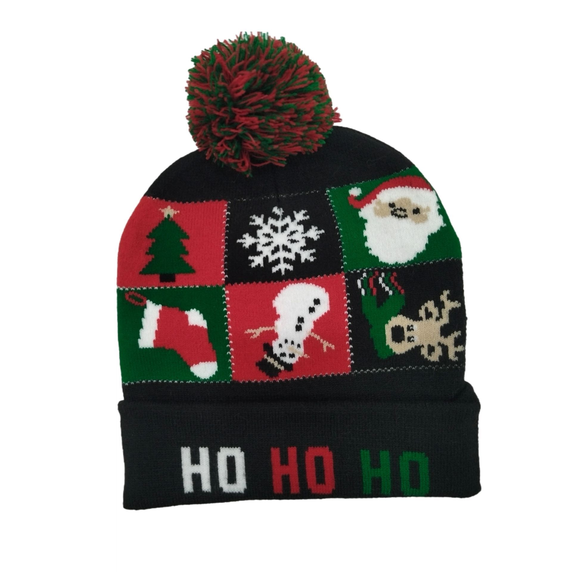 A colourful knitted winter hat with various Christmas-themed patterns, including snowflakes, Santa Claus, and the text "Ho Ho Ho" in bold, cheerful hues. For added festive cheer, the had lights up with embedded colourful lights in the design. The soft knit texture and lively motifs capture the spirit of the season with a modern edge.