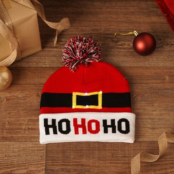 A red winter hat with a pom-pom on top, featuring the text "HO HO HO" in bold black and white, and a black and yellow belt-like design across the middle, it captures the spirit of Santa with a modern edge. For added festive cheer, the had lights up with embedded colourful lights in the design.The cheerful colours and graphic details add instant character.