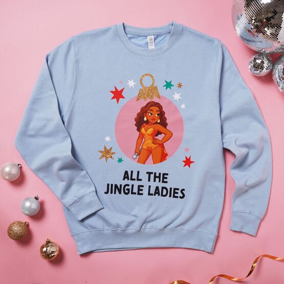 A light blue sweatshirt with a festive design featuring a female character surrounded by stars and the text "All the Jingle Ladies". Finished in soft blue, this piece combines cheerful graphics with a comfortable fit, perfect for relaxed holiday moments.