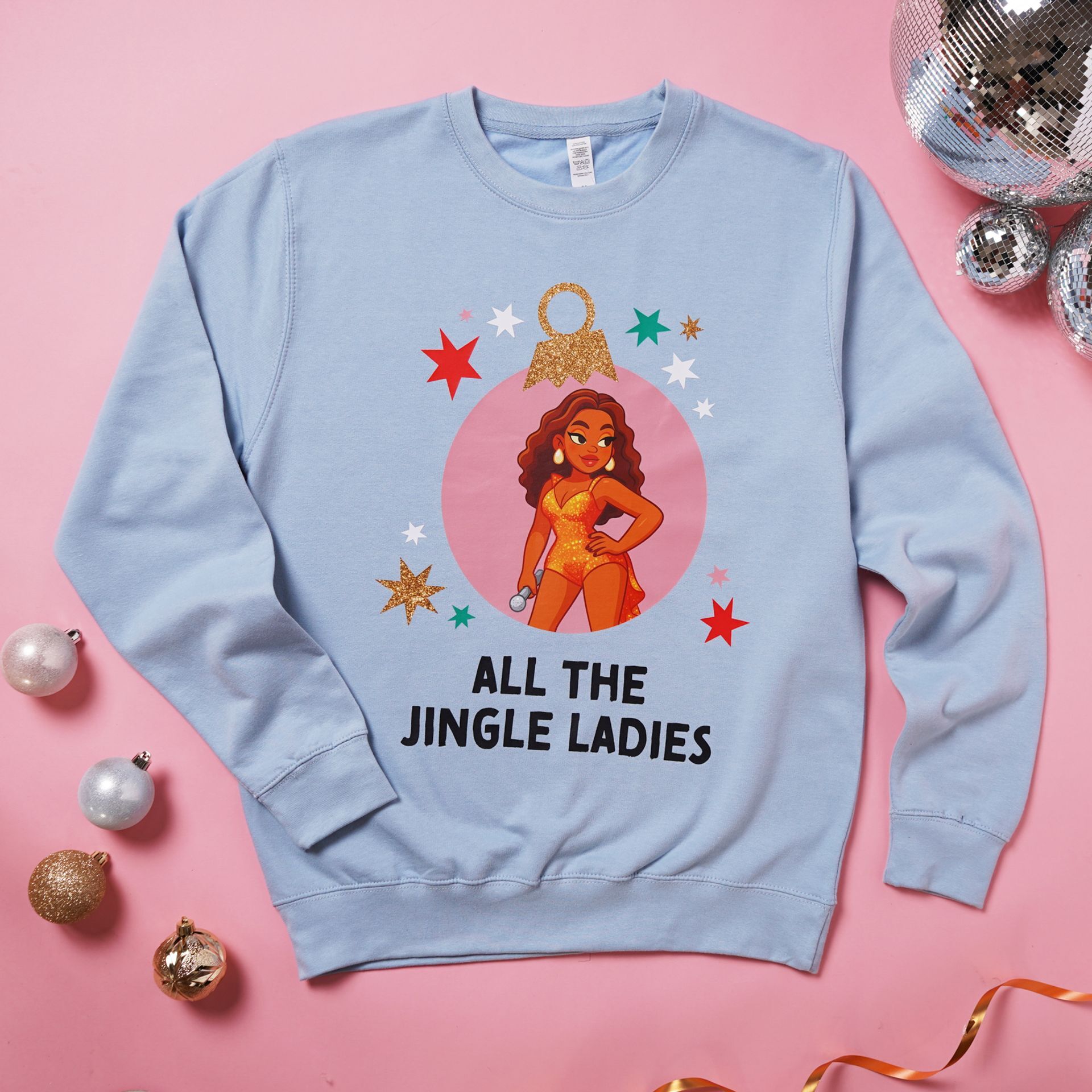 The light blue sweatshirt features a whimsical design of a female character surrounded by stars and the text "All the Jingle Ladies." Its soft colour and playful motif bring joyful nostalgia, ideal for cosy celebrations.