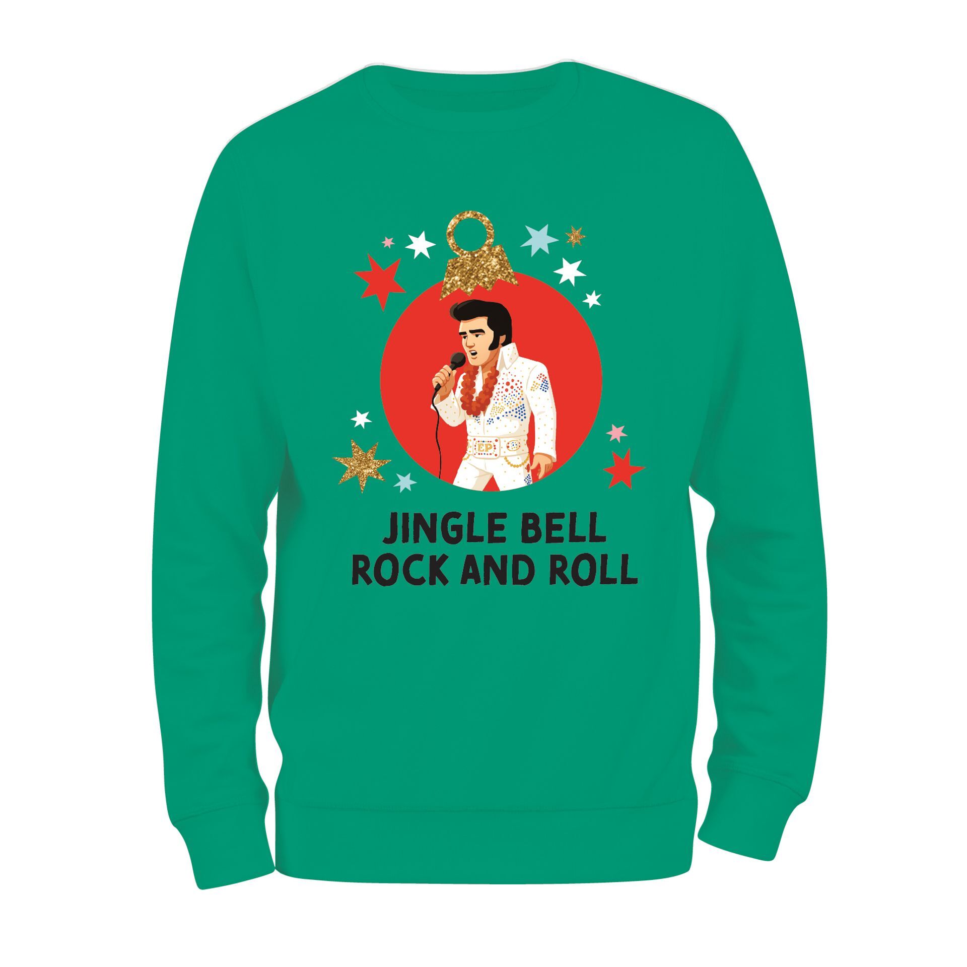 A green sweatshirt with a playful seasonal motif, it features an image of a famous musician alongside the text "Jingle Bell Rock and Roll". Its soft knit texture and relaxed silhouette add a touch of seasonal humour to any wardrobe.