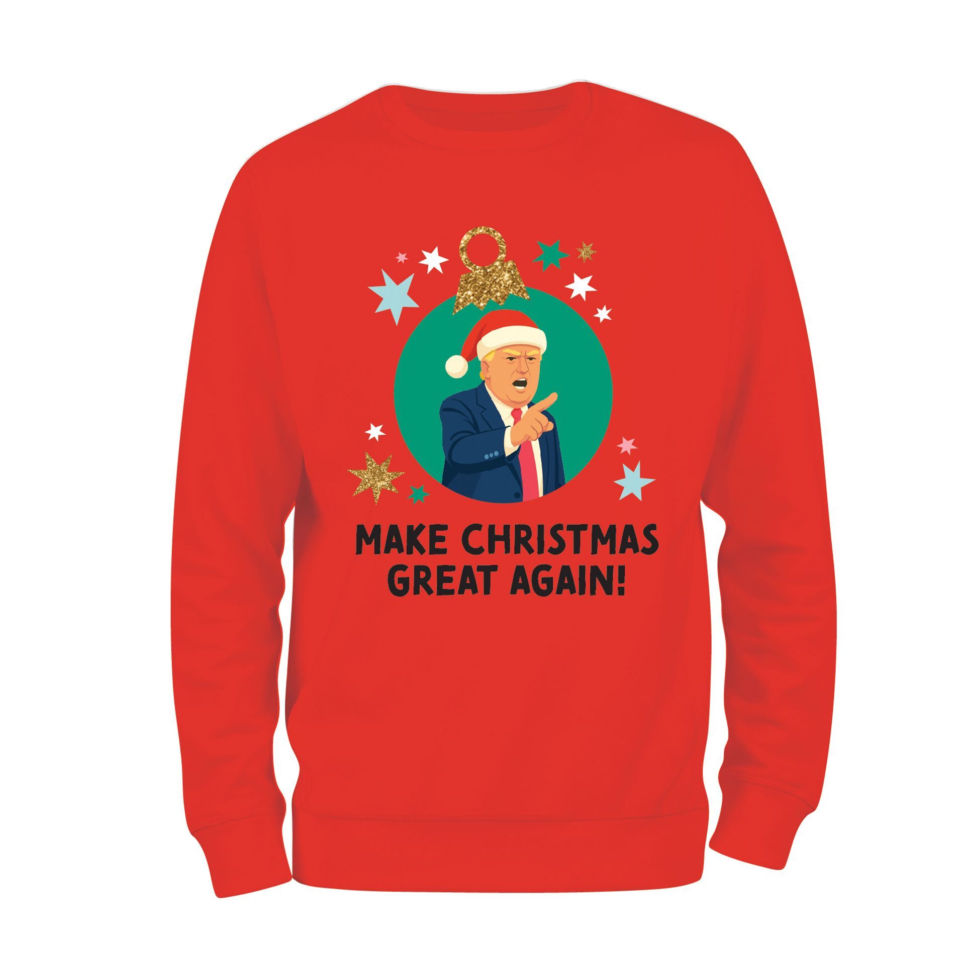 A red Christmas sweater featuring a cartoon-style image of a person in a Santa hat and the playful slogan "Make Christmas Great Again!". The bold colours and whimsical design evoke a sense of fun and warmth.