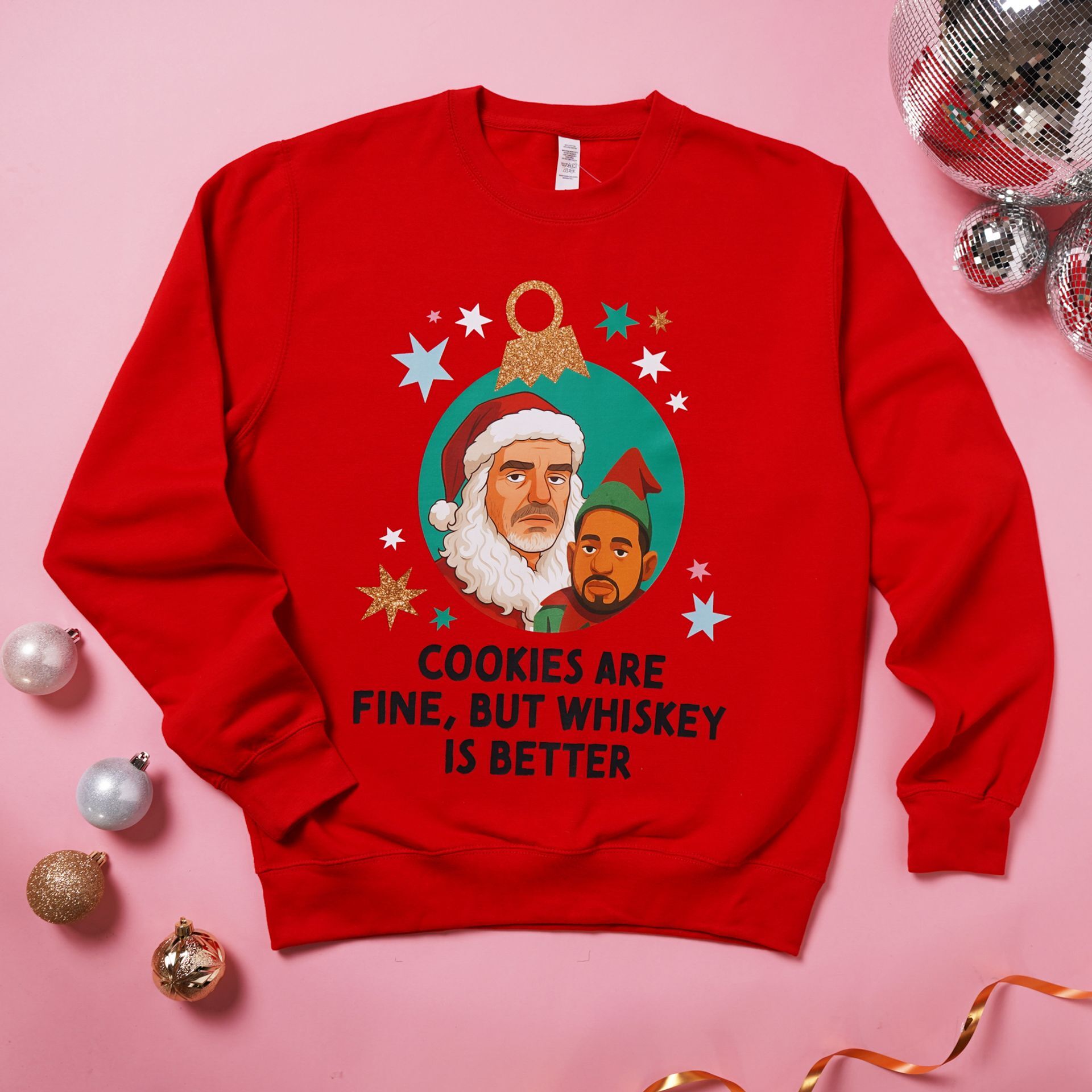 A vibrant red Christmas sweater, it features a bold graphic of Santa Claus and the phrase "Cookies are fine, but whiskey is better". The soft knit texture ensures comfort and warmth throughout the season.