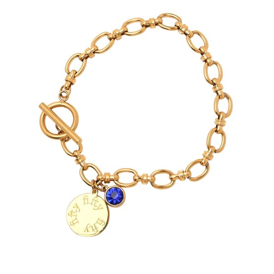 The CELEBRATIONS® Confetti Bracelet – 50 is a meaningful keepsake designed to celebrate a truly special milestone. Finished in a gold-tone with a classic chain and toggle fastening, it features an engraved “fifty” charm paired with a deep blue imitation birthstone for an elegant touch of sparkle.