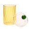 The glass trinket box showcases an attractive recurring ripple pattern. The container is yellow in colour, the lid is clear and the lid handle is green. There is an originality here that will appeal to many.