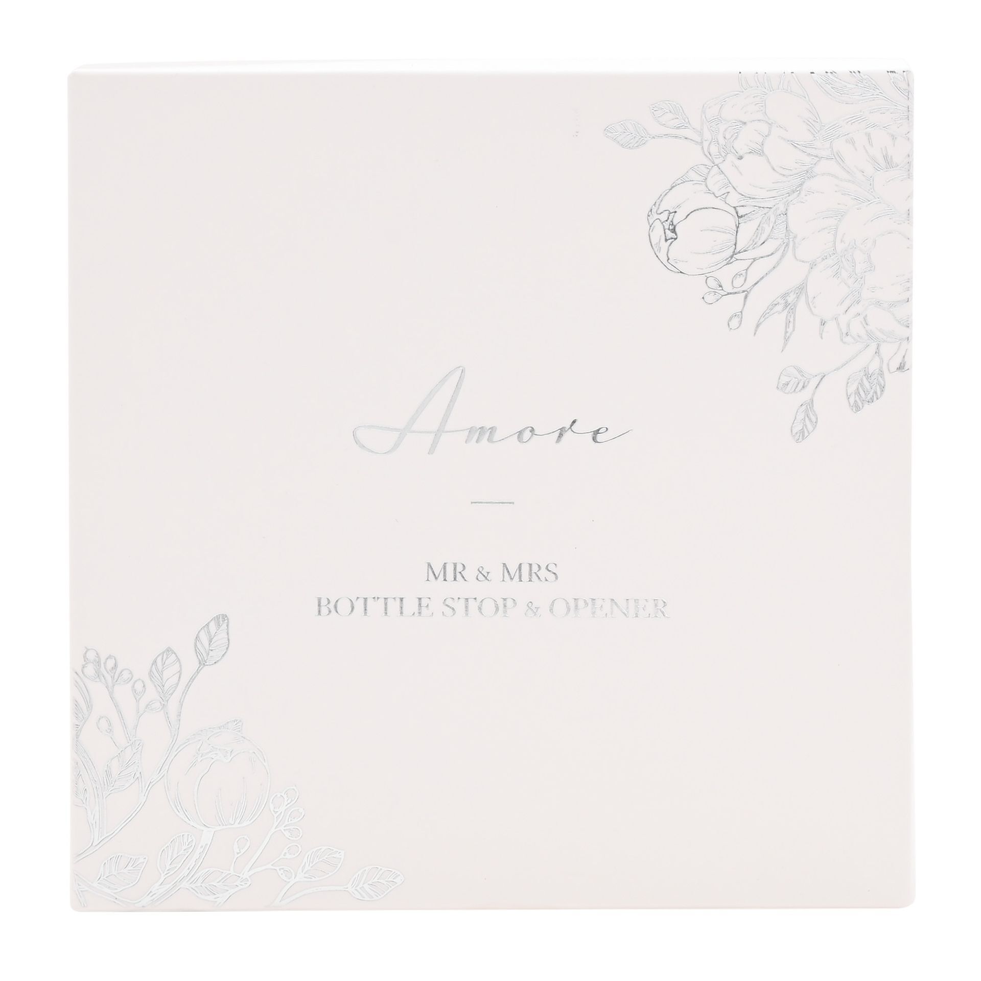 A charming Mr & Mrs wedding day bottle stop and opener set in a luxury lidded gift box. From AMORE BY JULIANA® - timeless giftware to celebrate the enduring wonder of love.