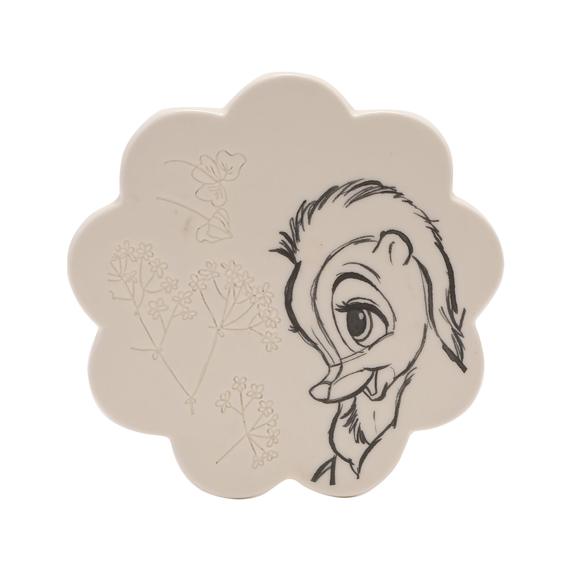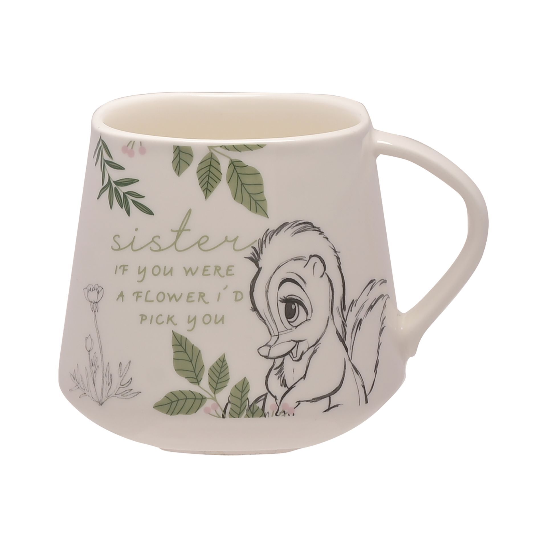 The ceramic mug features a gloss white finish, complete with a printed image of Flower from Bambi, alongside its ‘Sister - If I Were A Flower I’d Pick You’ title, all of which is repeated on both sides. It is paired with a matching coaster which is further by foliage engravings.