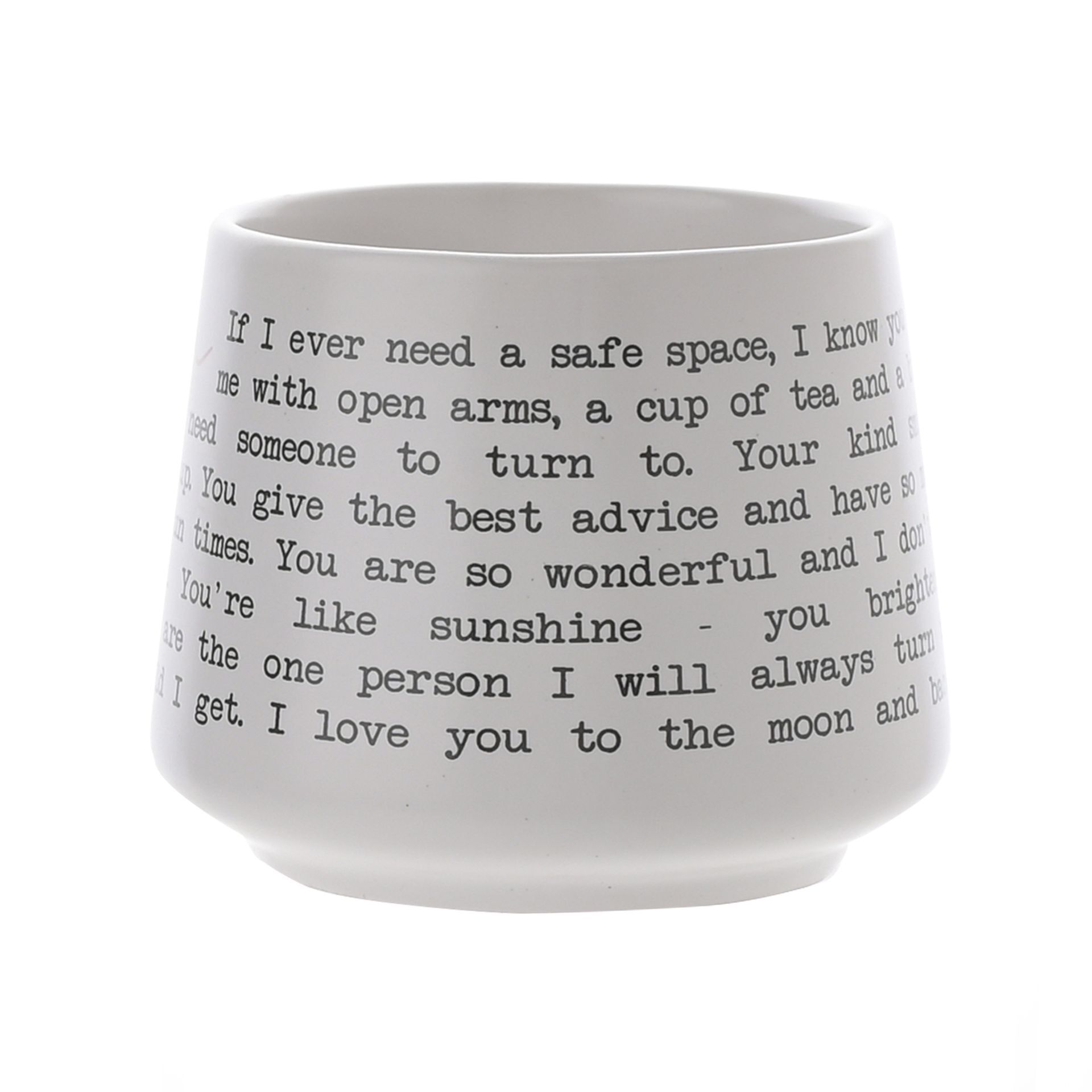 The stoneware mug features a white finish throughout, complete with a long, sentimental quote which stretches around it. The word ‘Grandma’ bookmarks the quote in decorative silver lettering.