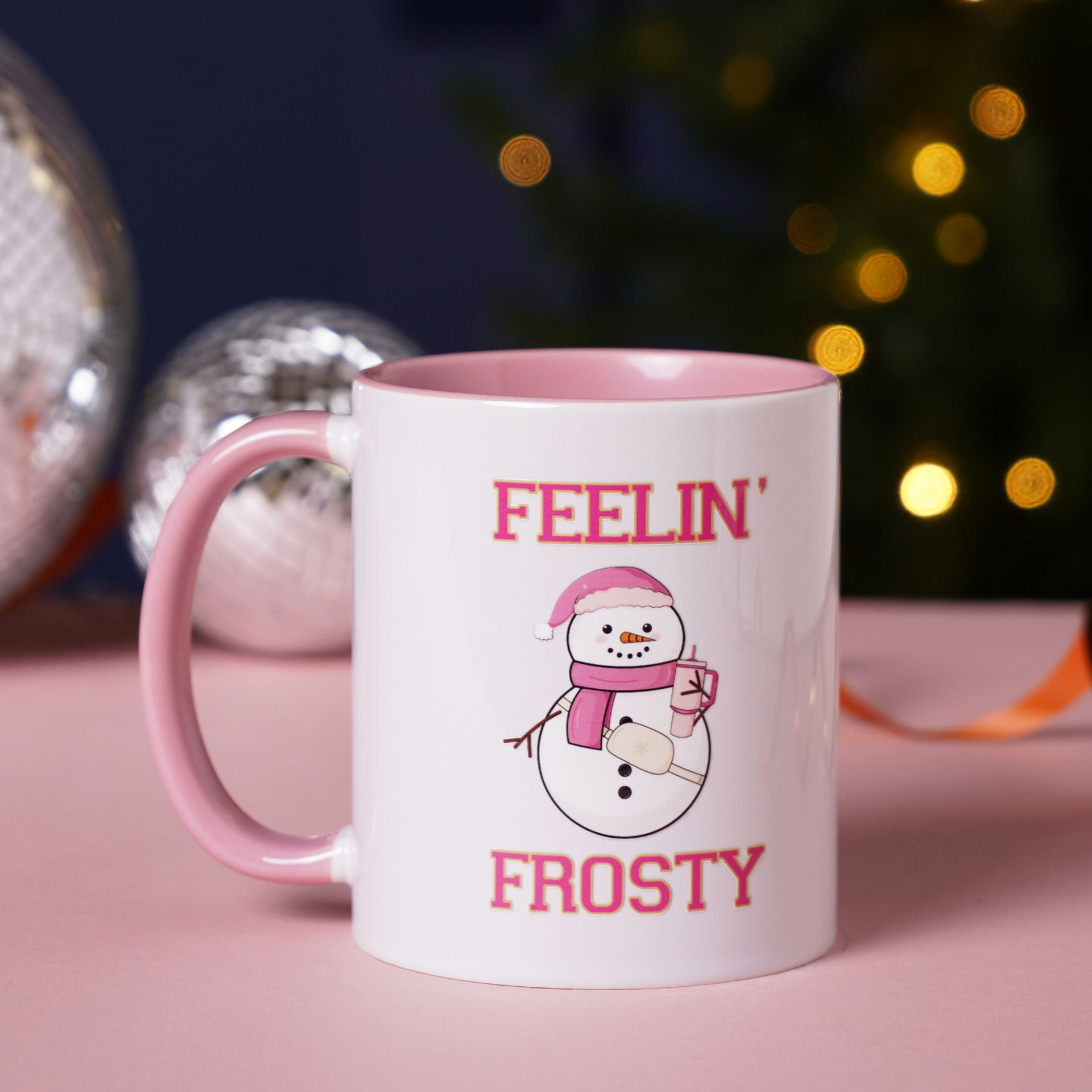 A pink mug with the text "FEELIN' FROSTY" and a cheerful cartoon snowman illustration brings a touch of whimsy to every sip.The glossy finish and vibrant colours evoke the joyful nostalgia of Christmas mornings.