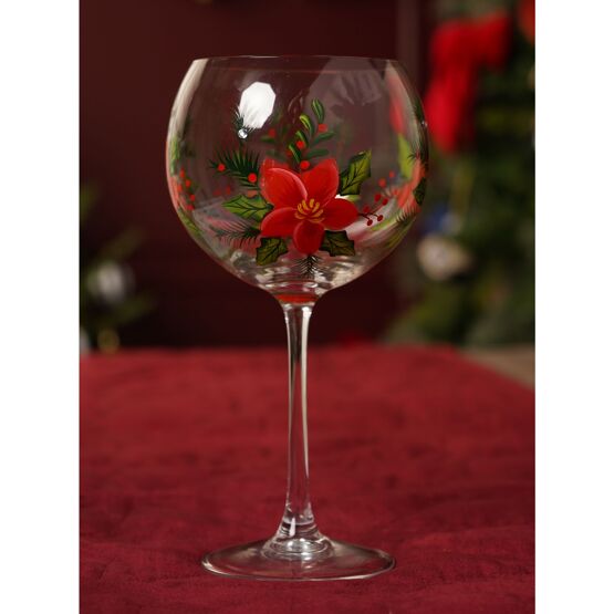 A glass wine goblet with a decorative floral pattern featuring red poinsettia flowers and green leaves. Hand-painted detailing and four sparkling stones add a touch of modern opulence to the classic silhouette.
