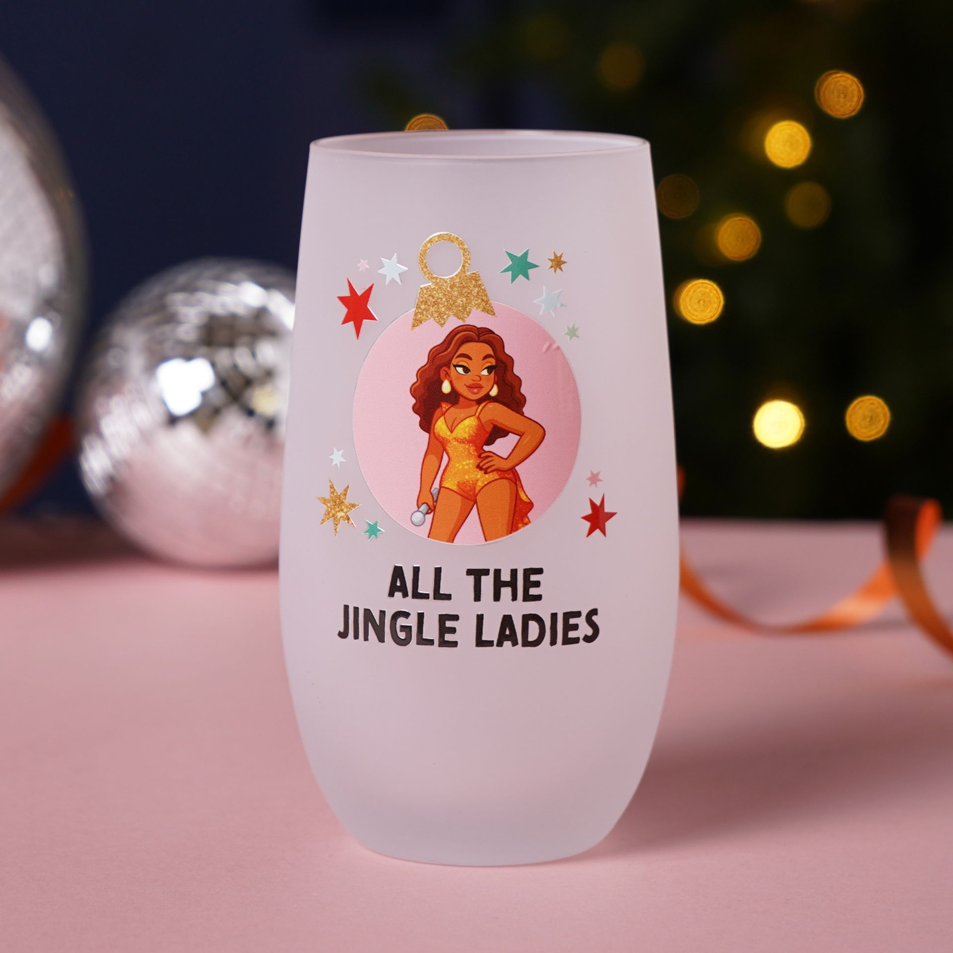 This wine glass tumbler with a humorous iconic illustration accompanied by the text "All the jingle ladies" finished with frosted detailing and festive lights for a cheerful seasonal accent.
