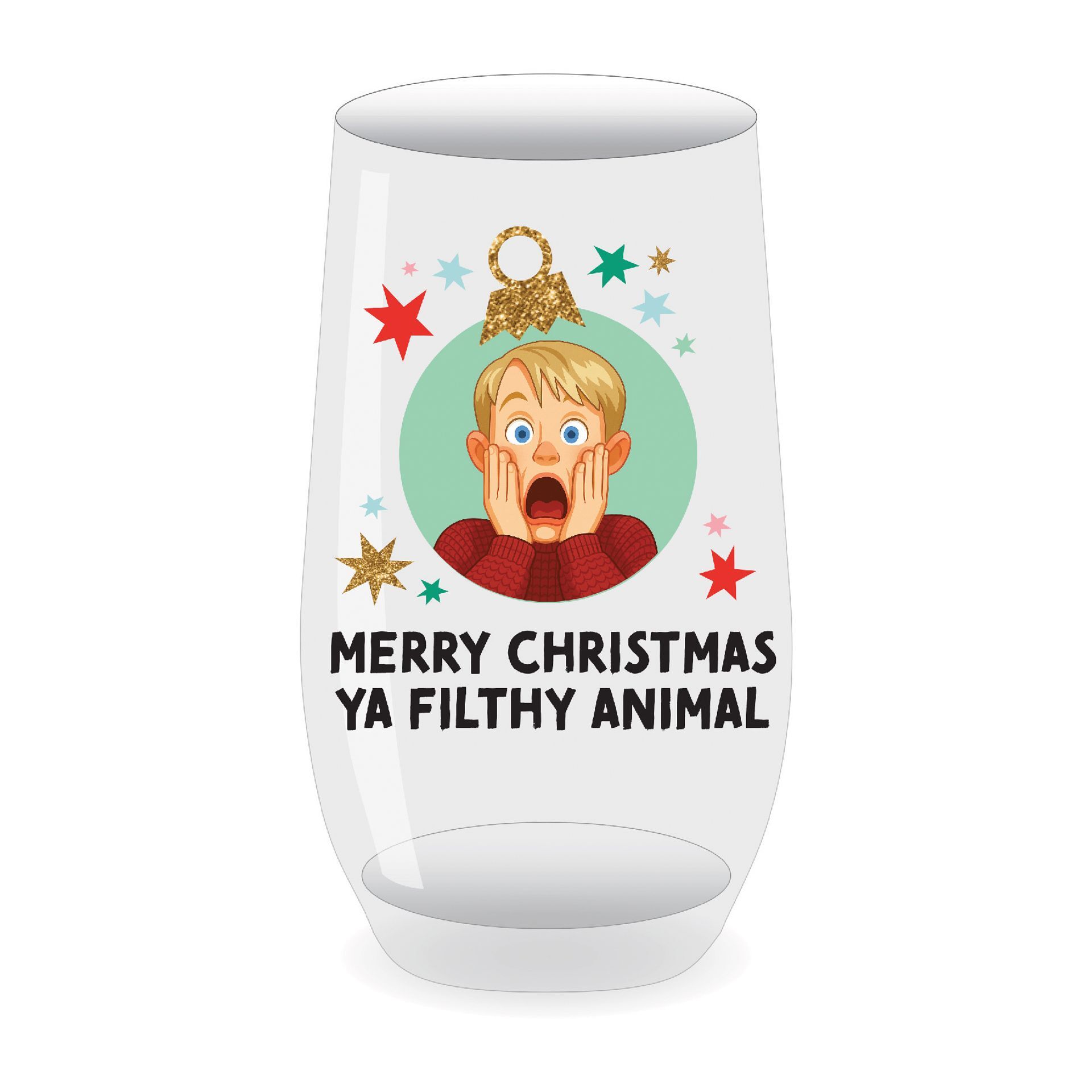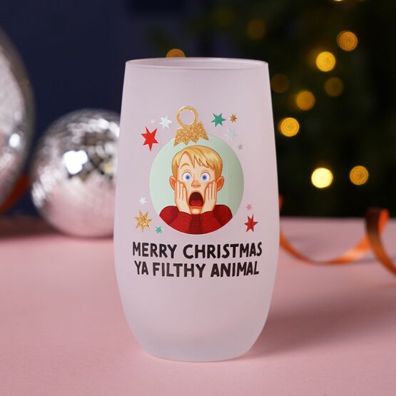 This wine glass tumbler with a humorous iconic illustration accompanied by the text "MERRY CHRISTMAS YA FILTHY ANIMAL," finished with frosted detailing and festive lights for a cheerful seasonal accent.