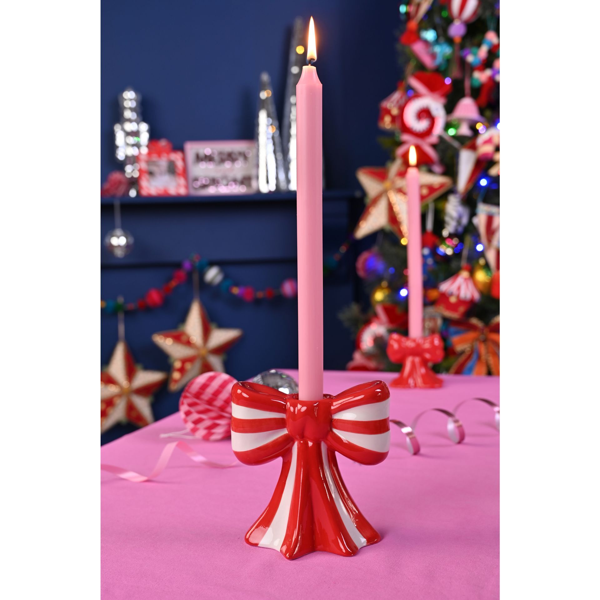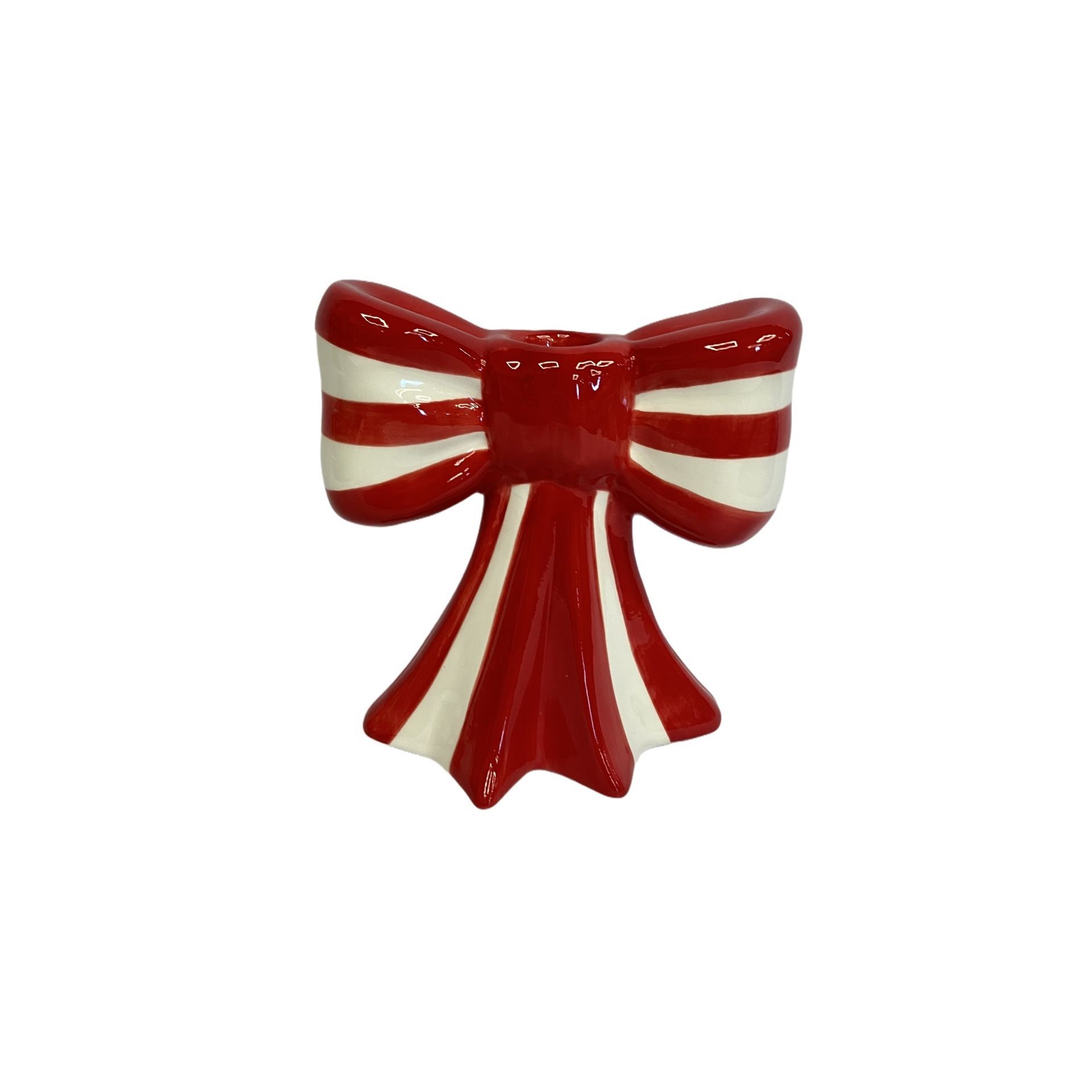 The Candle Holder in Red & White with Bow 5.75" is a red and white candle holder crowned with a striped bow and cheerful showtime flair.