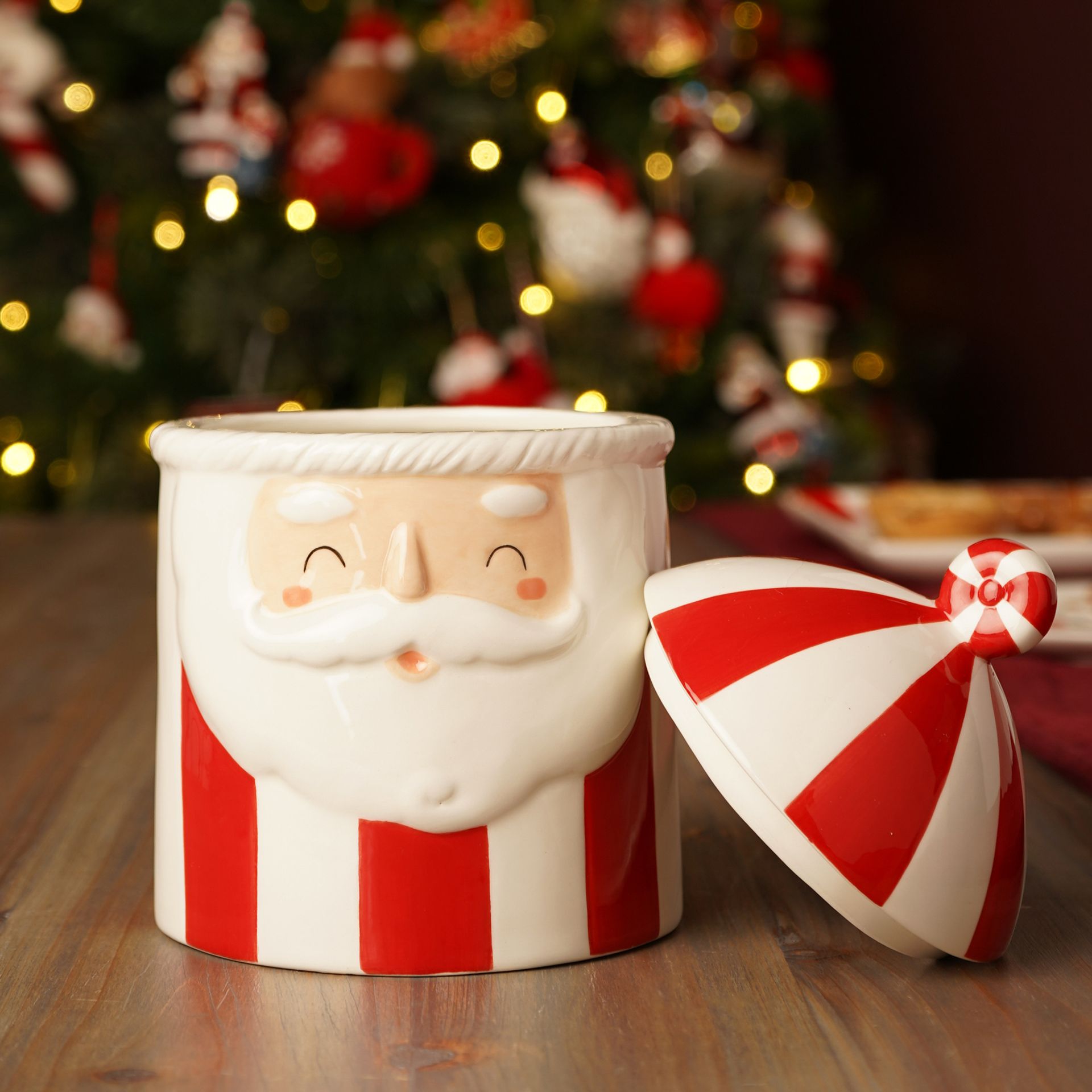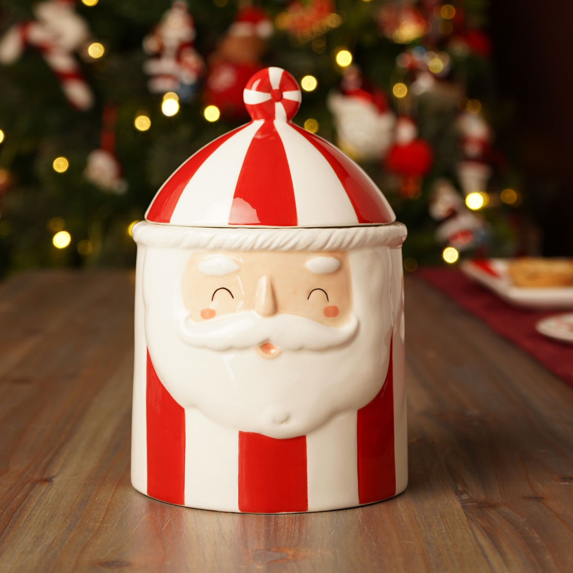 The Candy Stripe Santa Cookie Jar 8" is a playful ceramic cookie jar shaped like Santa in bold candy stripes.
