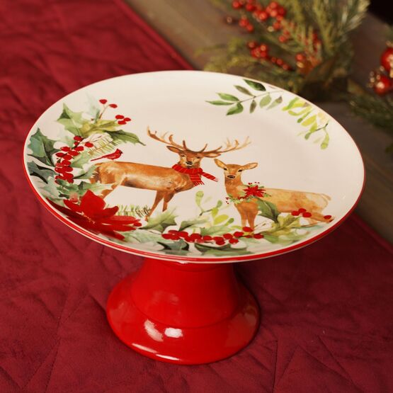 The Ceramic Natural Effect Cake Stand with Red Base and Deer in Foliage Pattern brings festive charm to seasonal gatherings.