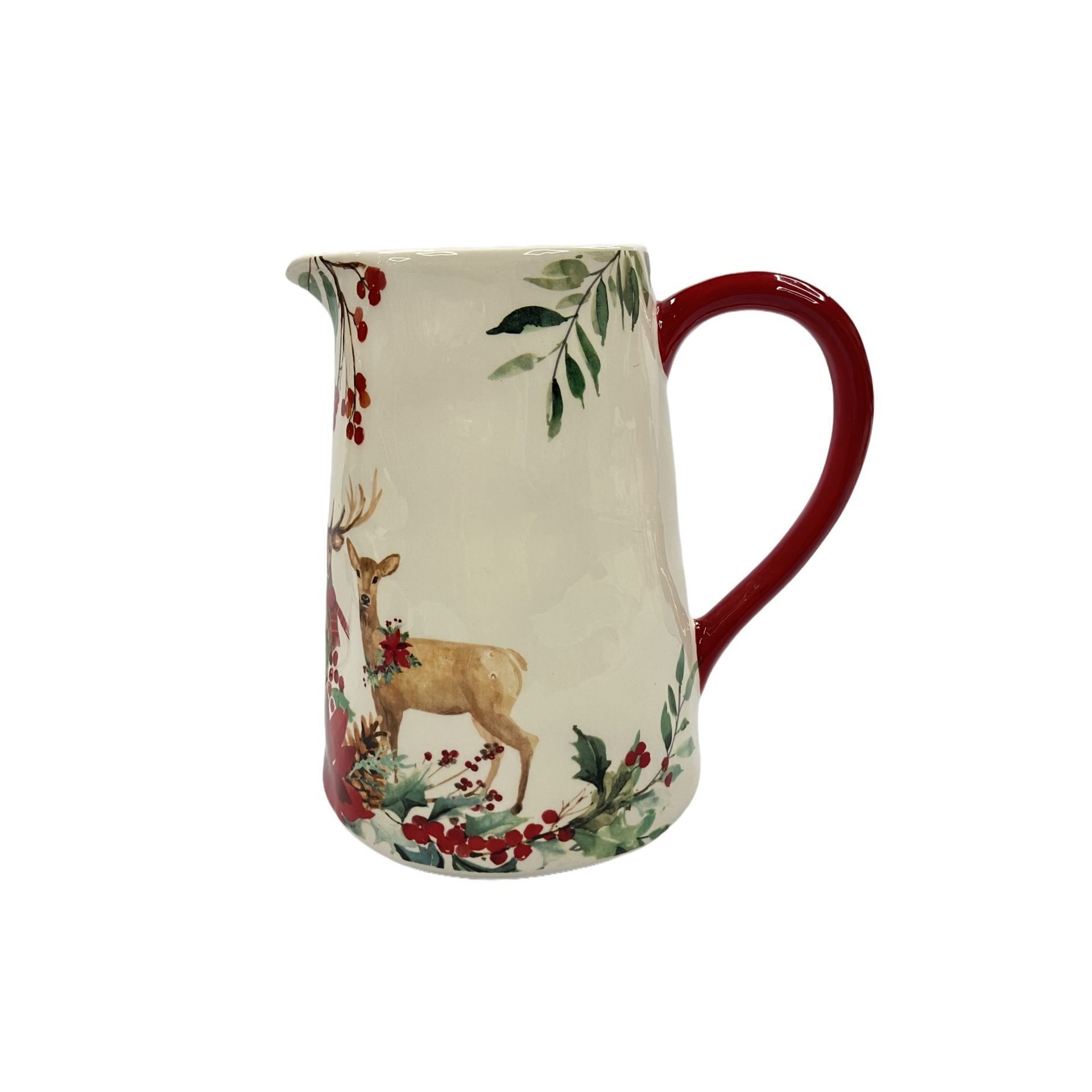 The Ceramic Natural Effect Jug with Red Handle and Deer in Foliage Pattern brings festive charm to seasonal gatherings, making it a perfect centerpiece. This ceramic pitcher features a beautifully detailed deer surrounded by holly leaves and berries, accented with a bold red handle. The natural effect finish adds a subtle touch of tradition to its clean, modern form. Complete the look with more refined designs from the Regal Tidings collection, enhancing your seasonal decor.