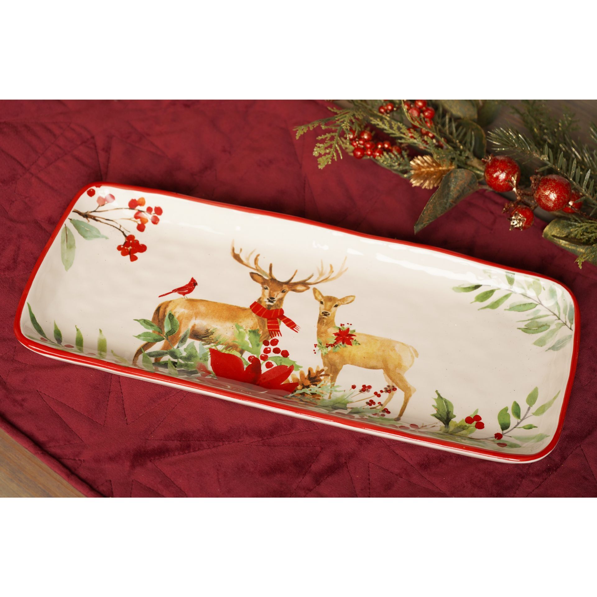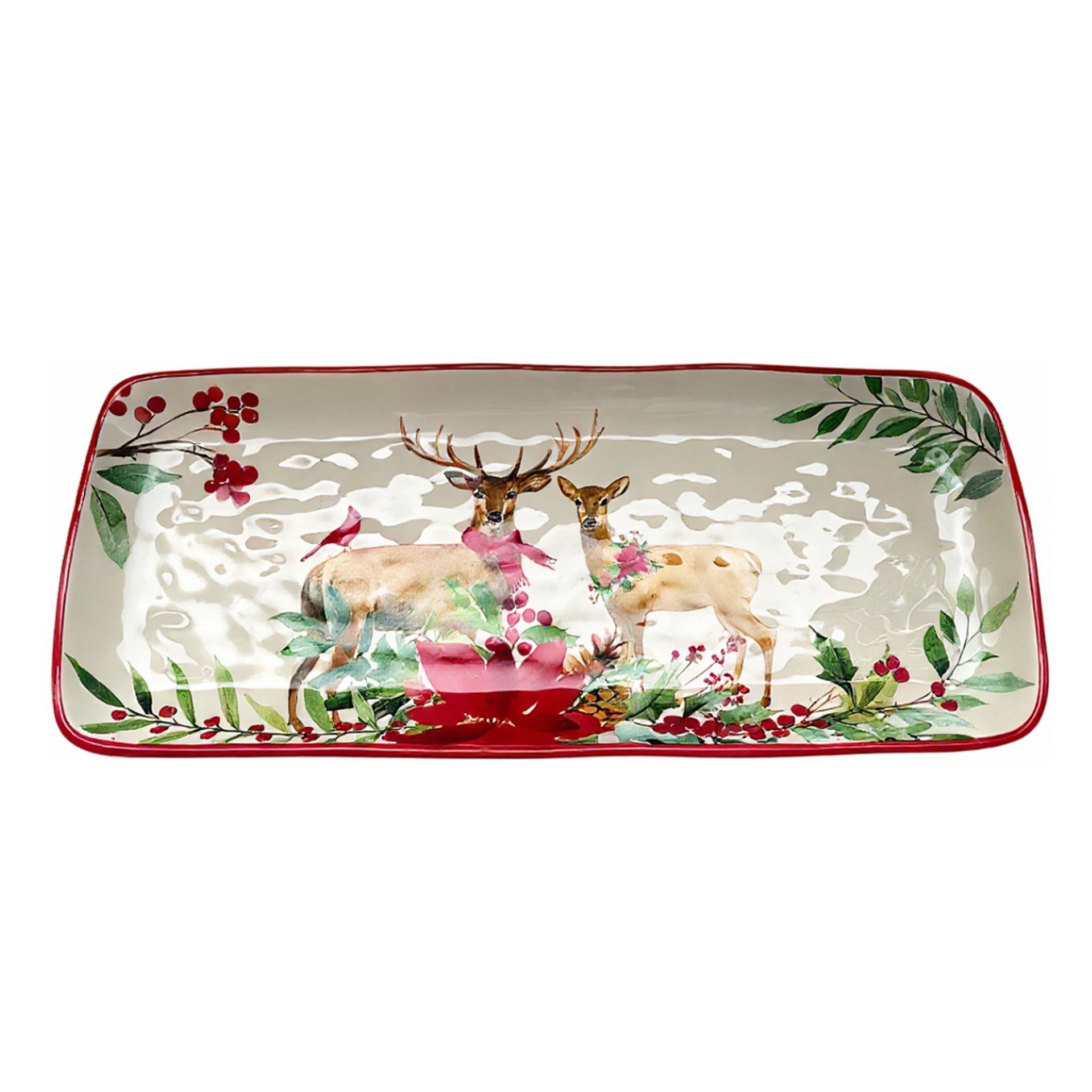 This decorative tray features a winter scene with two deer standing in a snowy landscape, surrounded by holly and seasonal foliage. The natural ceramic finish is accented by a bold red rim for a refined yet inviting look.
