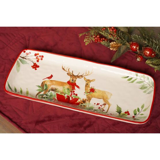 The Ceramic Natural Effect Rectangular Serving Plate with Red Lip and Deer in Foliage Pattern brings festive artistry to the Christmas table.