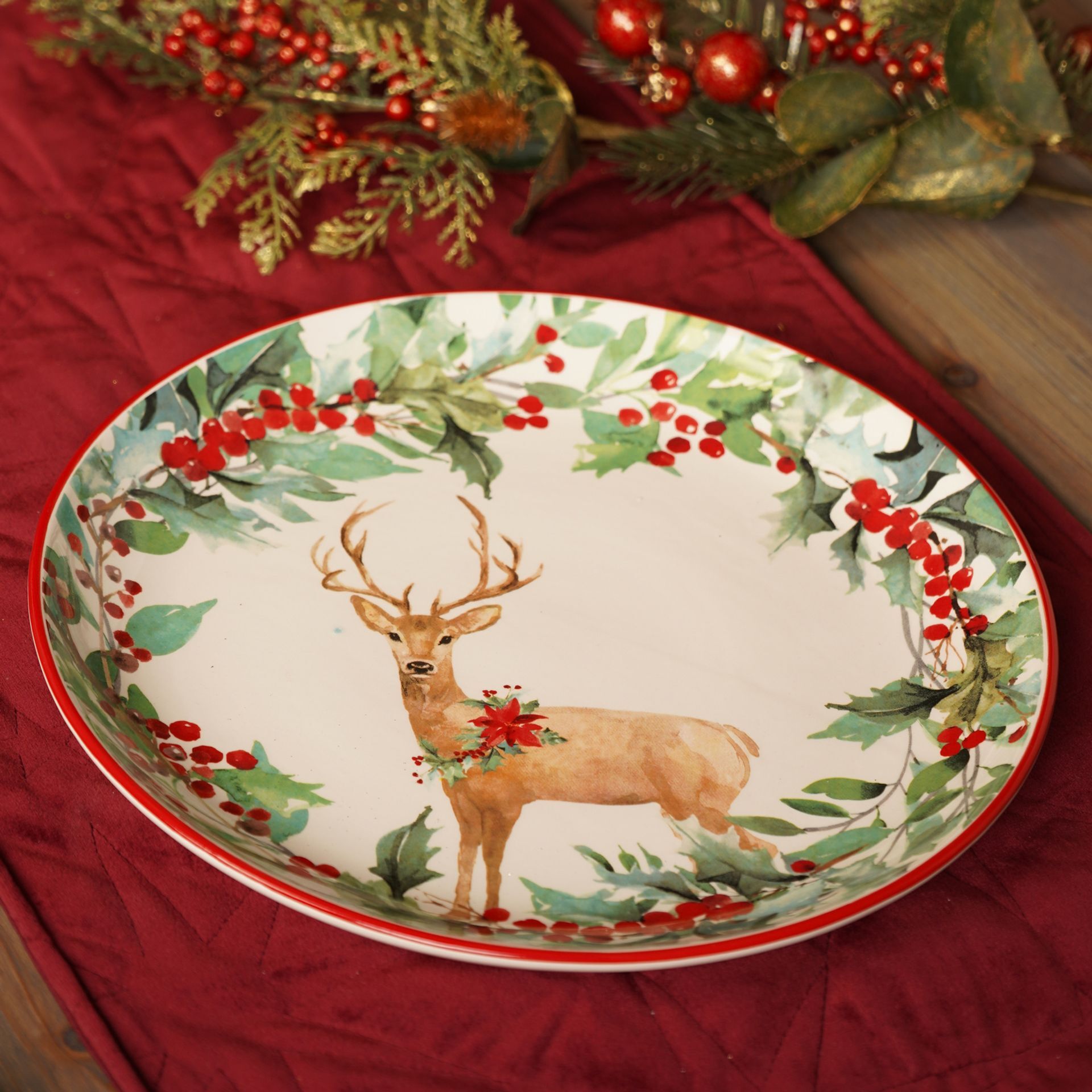 The Ceramic Natural Effect Serving Plate with Red Lip and Deer in Foliage Pattern brings festive charm to seasonal gatherings, making it a perfect addition to seasonal tableware. This decorative plate showcases a deer standing in a wreath of holly and berries, accented by a bold red rim. The natural ceramic finish adds a refined touch to classic Christmas motifs. Complete the look with refined designs from the Regal Tidings collection.