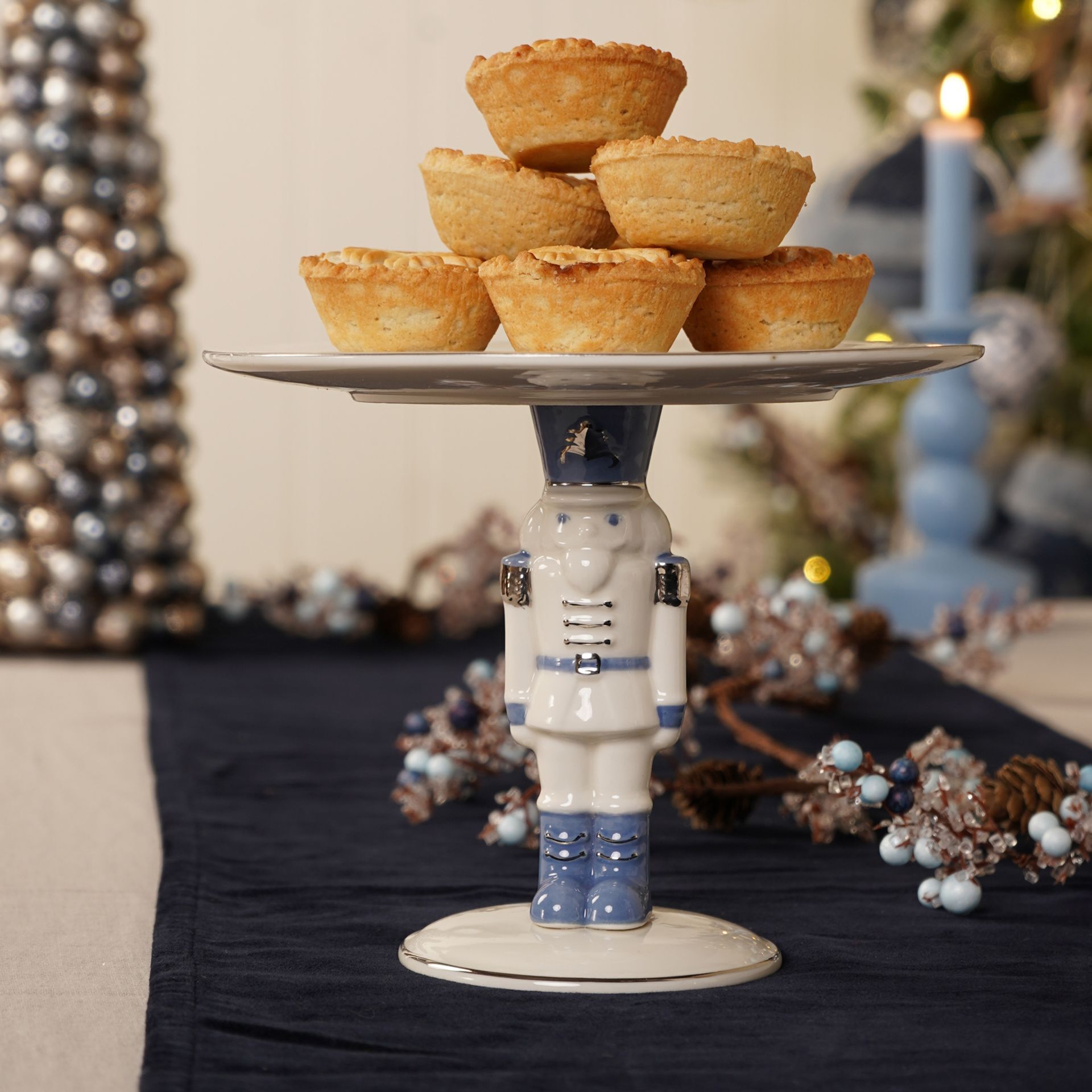 The Ceramic Nutcracker Cake Stand lends a playful focal point to seasonal entertaining within the Turtle Dove collection.