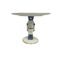 A small, round table with a white top and a metal base in the shape of a nutcracker. The clean lines and blue accents give a subtle nod to chinoiserie motifs.