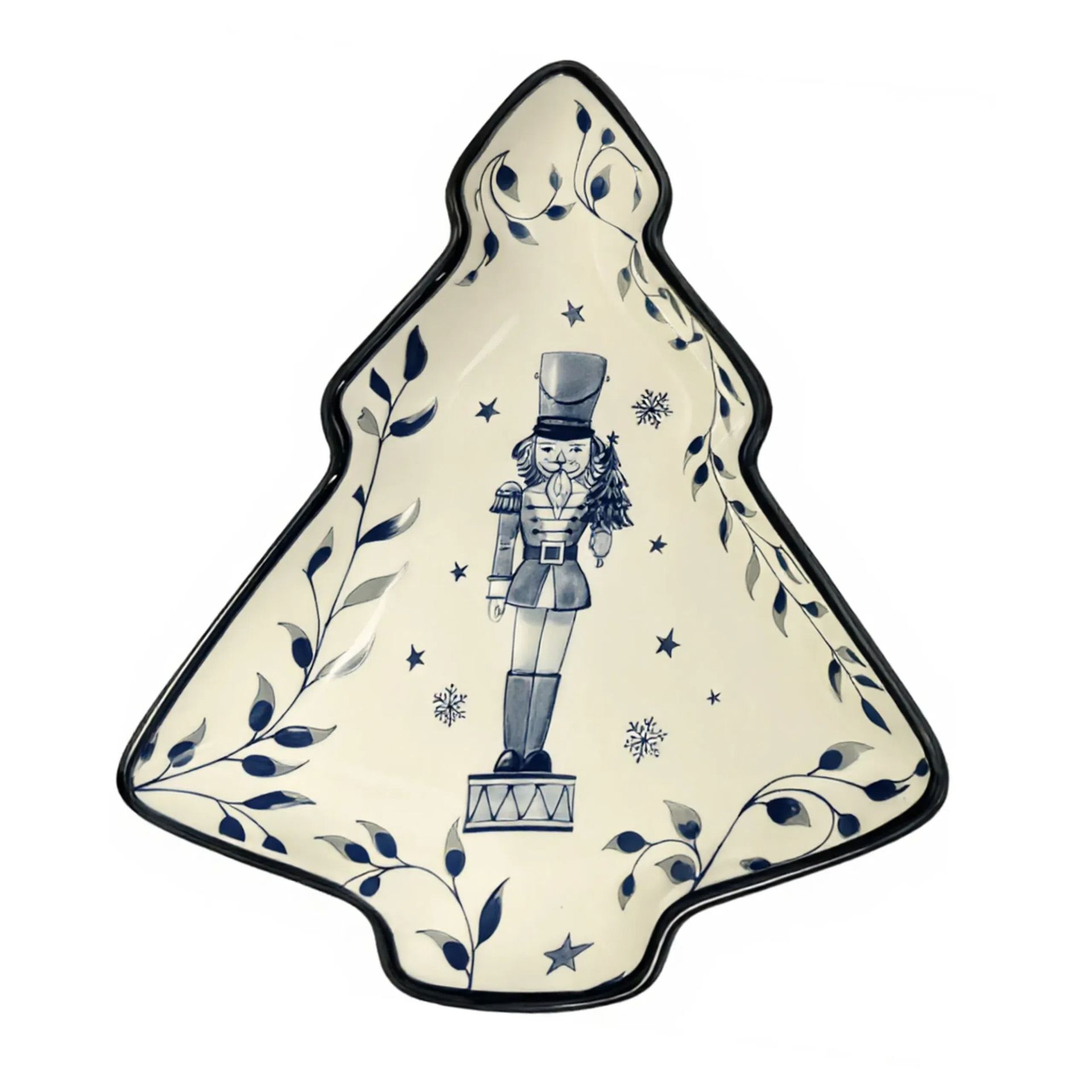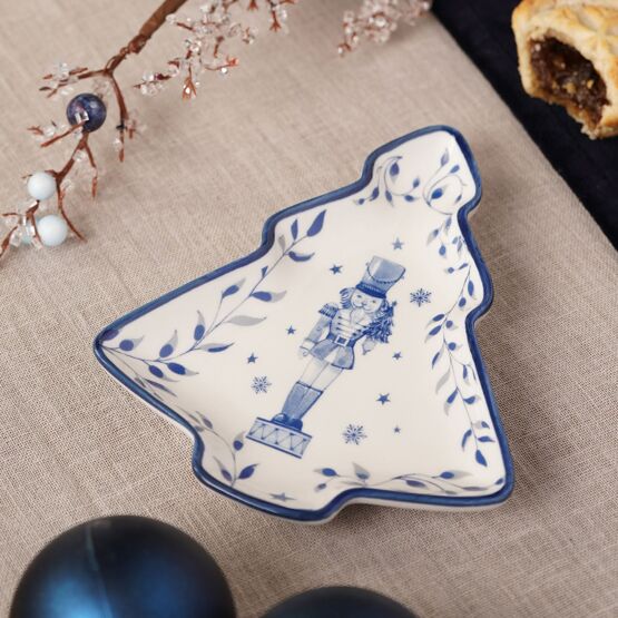 A stylised Christmas tree plate with a nutcracker figure in the centre, surrounded by a decorative pattern of leaves, stars, and snowflakes. Blue and white tones reflect the Turtle Dove collection's signature blend of classic motifs and subtle colour.
