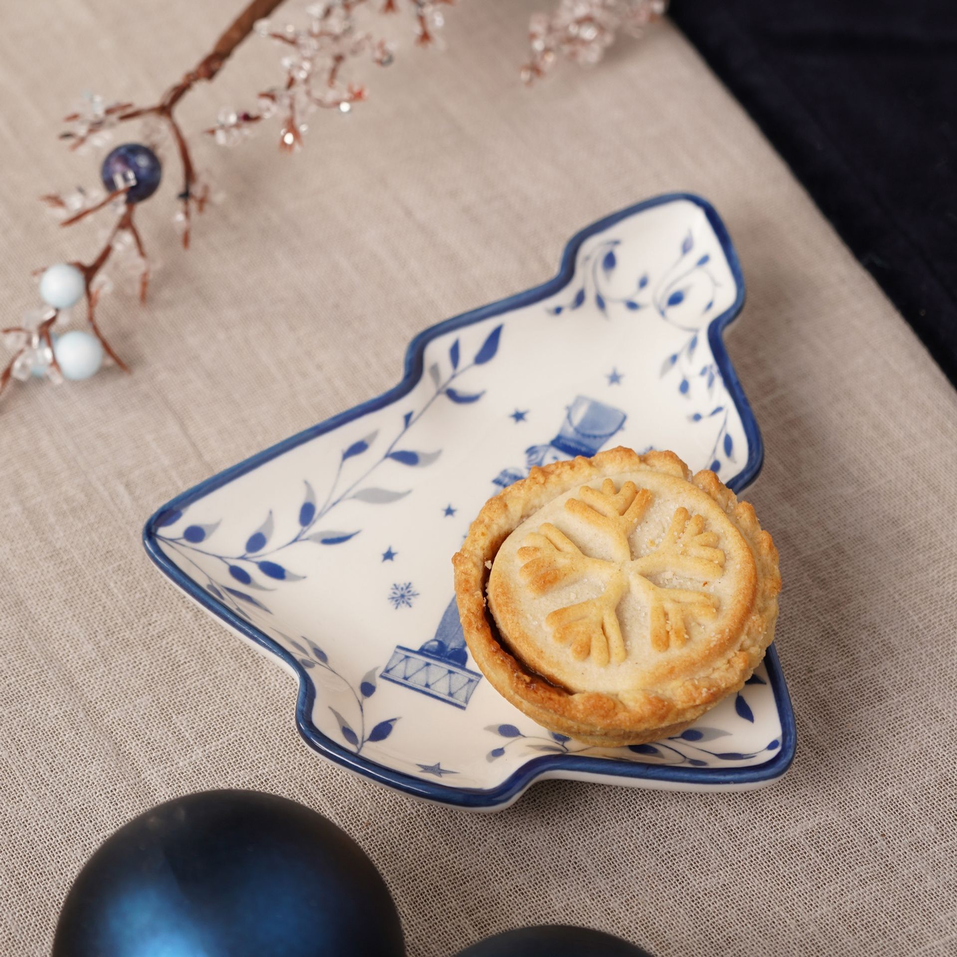 The Christmas Tree Shaped Plate - White & Blue offers a refined accent for festive tables and seasonal displays.