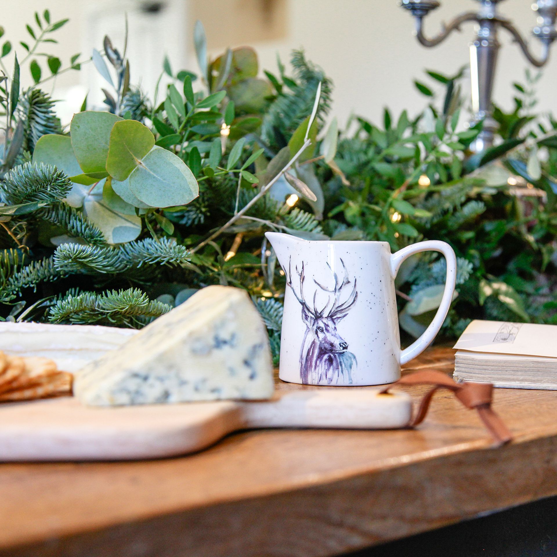 The jug showcases white, speckled ceramic, complete with a beautiful stag image from Meg Hawkins. It is completed by a matching integrated handle and spout.