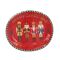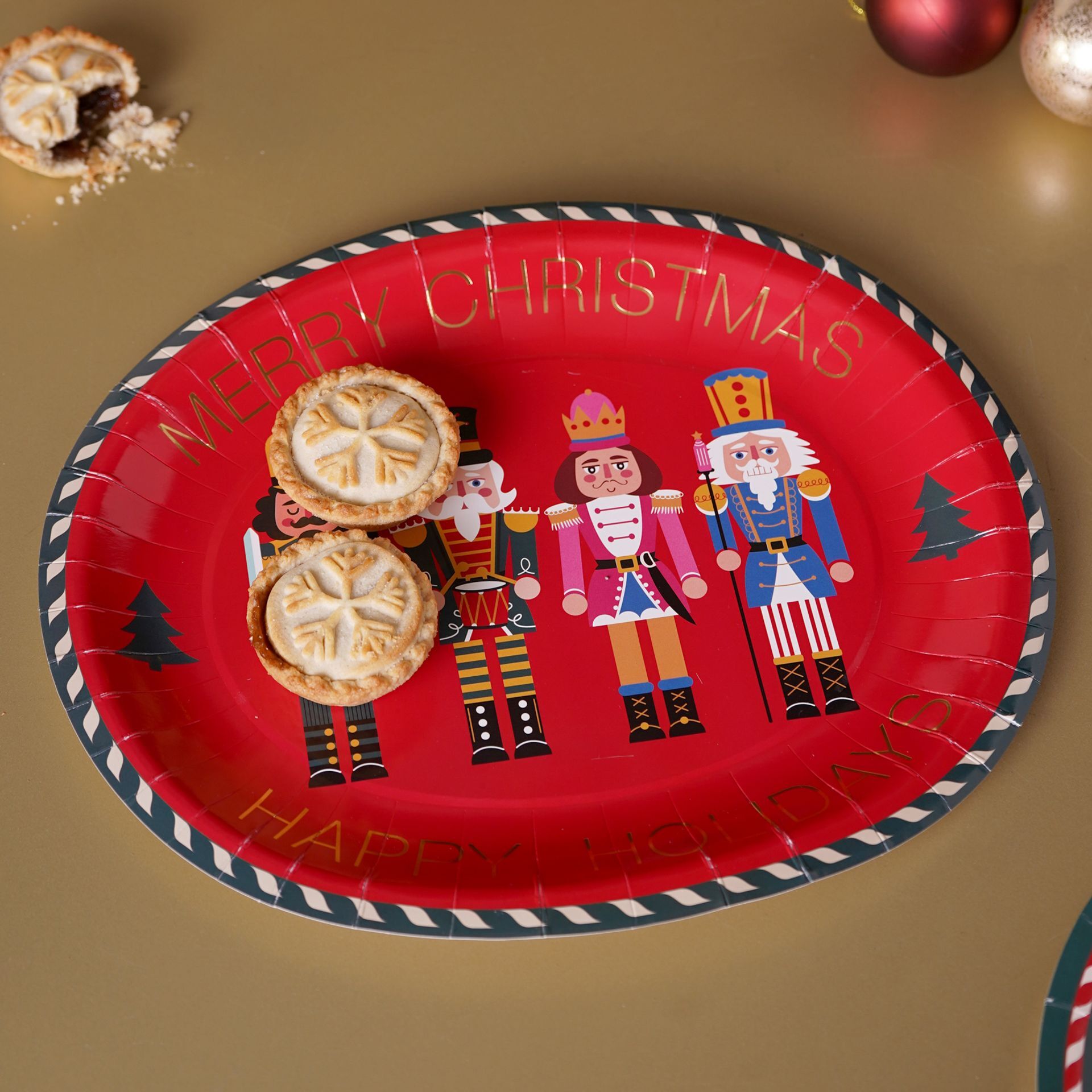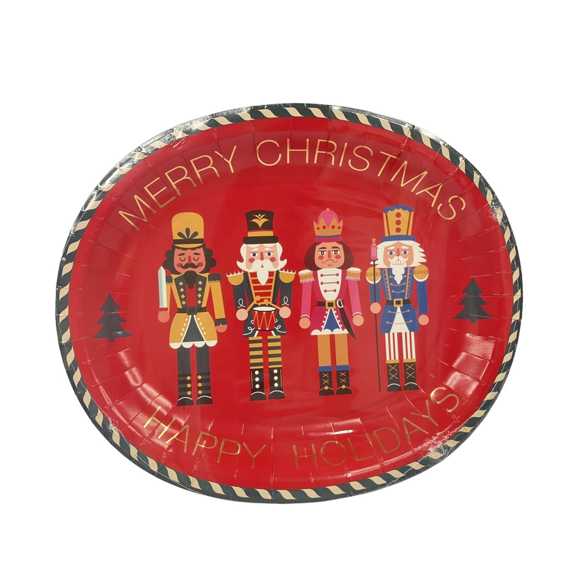 Each red oval-shaped plate features a "Merry Christmas" message and showcases several nutcracker figurines in the foreground, accented by classic Christmas trees. The playful motif and vibrant colours add a cheerful touch to seasonal tables.