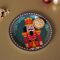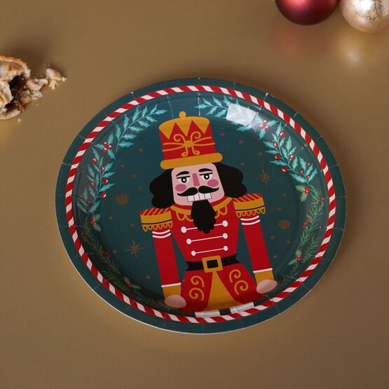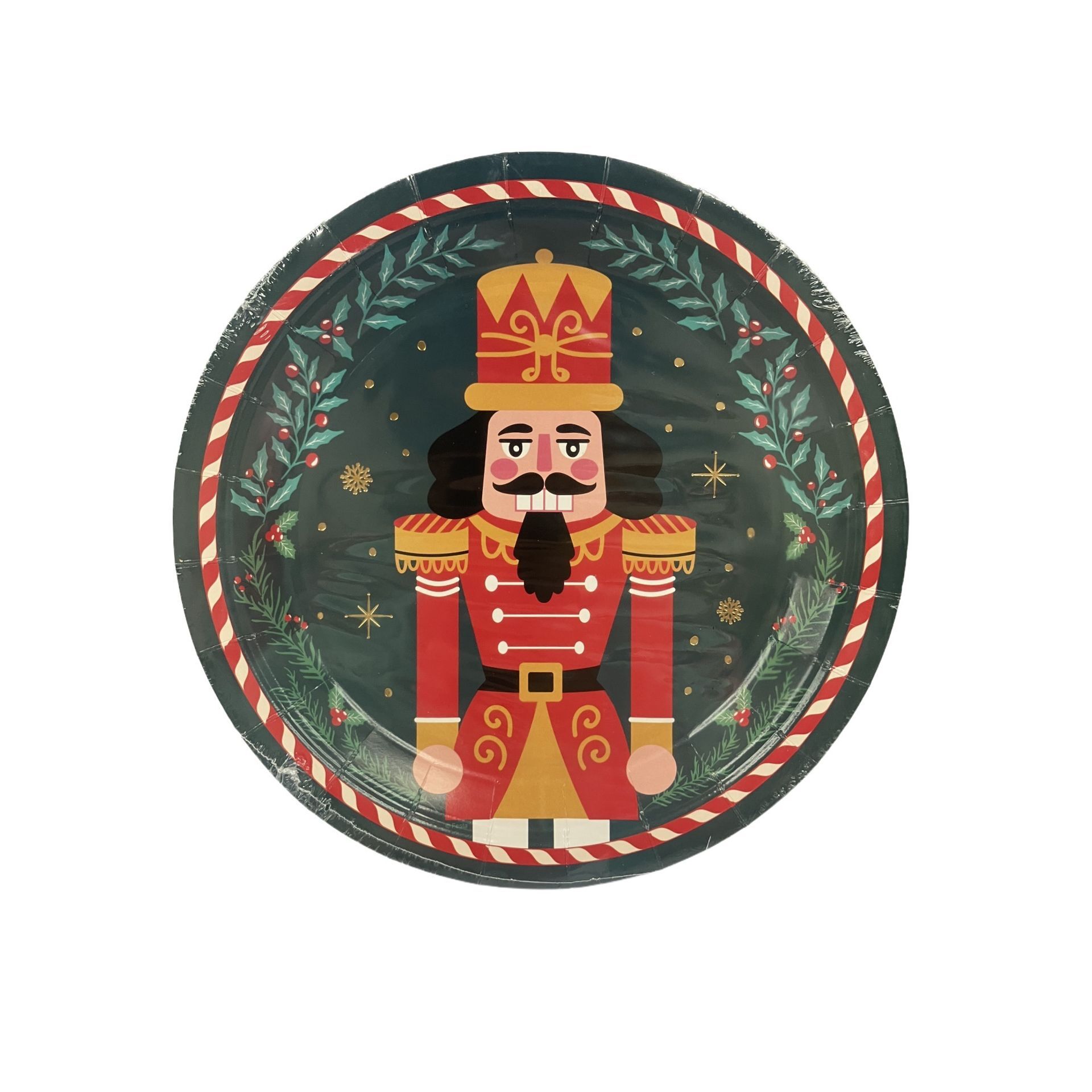 A circular design features a nutcracker soldier in a red uniform, surrounded by a wreath of greenery and seasonal decorations. The paper plates offer a practical yet stylish solution for Christmas entertaining.