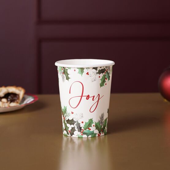 Each paper cup features the word "Joy" in elegant script, surrounded by a classic holly motif in rich green and red tones. The design captures the warmth and cheer of Christmas, making every sip feel special.
