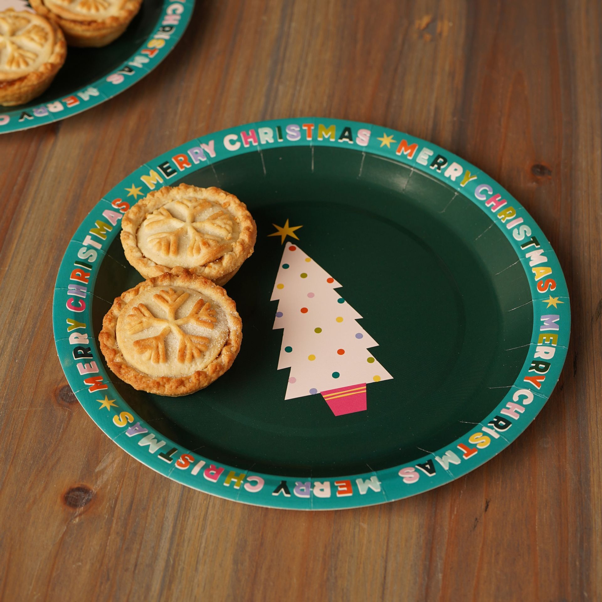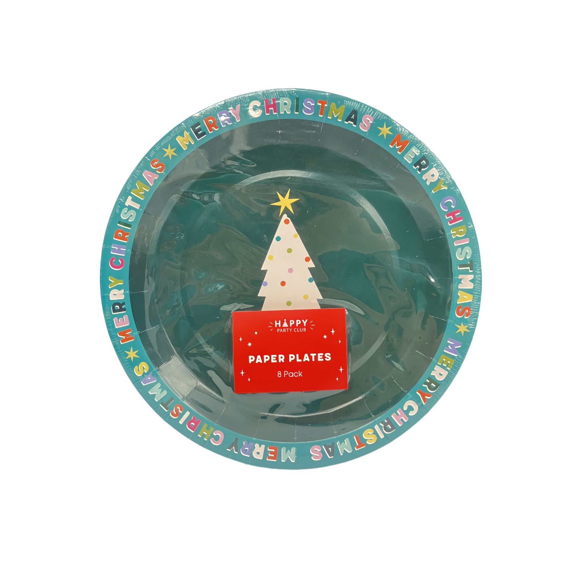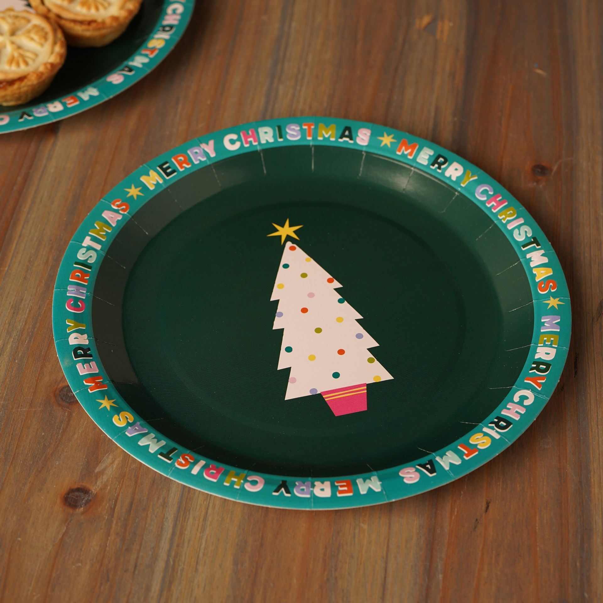 A green circular plate displays a charming Christmas tree and a "Merry Christmas" border, perfectly complementing the inner red paper plate stamped with "Happy Paper Plates". The lively colour pairing and round form deliver cheerful energy to the Christmas table.