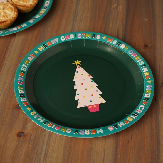 The MULTI 12 Set of 8 Christmas Tree Round Paper Plates is a playful tableware addition designed for festive gatherings.