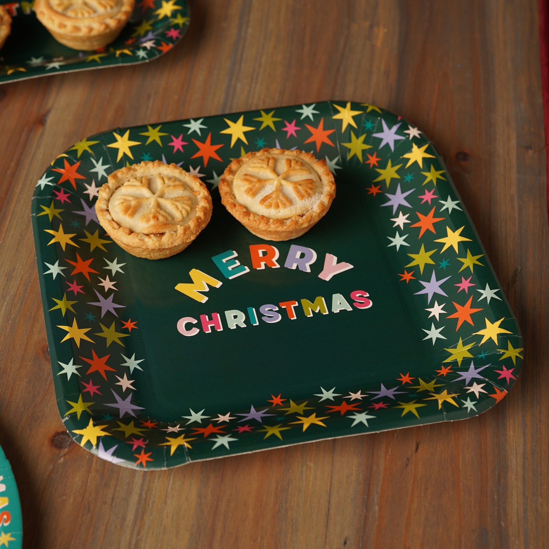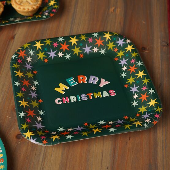 A square-shaped paper plate with a "Merry Christmas" message and colourful star patterns decorating the surface, these plates blend playful charm with practical design. The bold motif and vibrant palette create a cheerful backdrop for holiday treats.