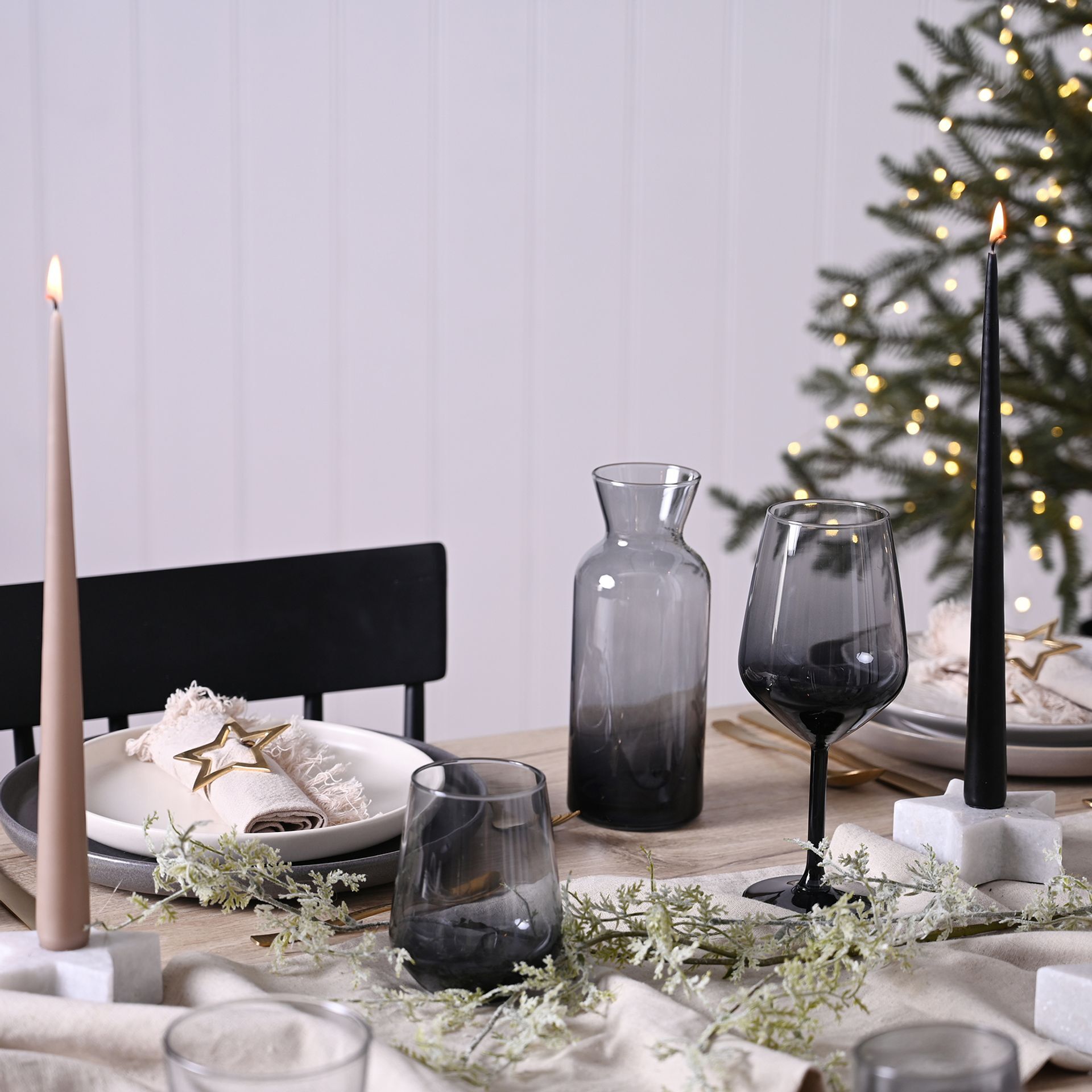 The ombre carafe showcases smoked grey glass which darkens towards the base and includes a matching tumbler which doubles as a lid. It forms part of a matching range of glassware for all occasions.