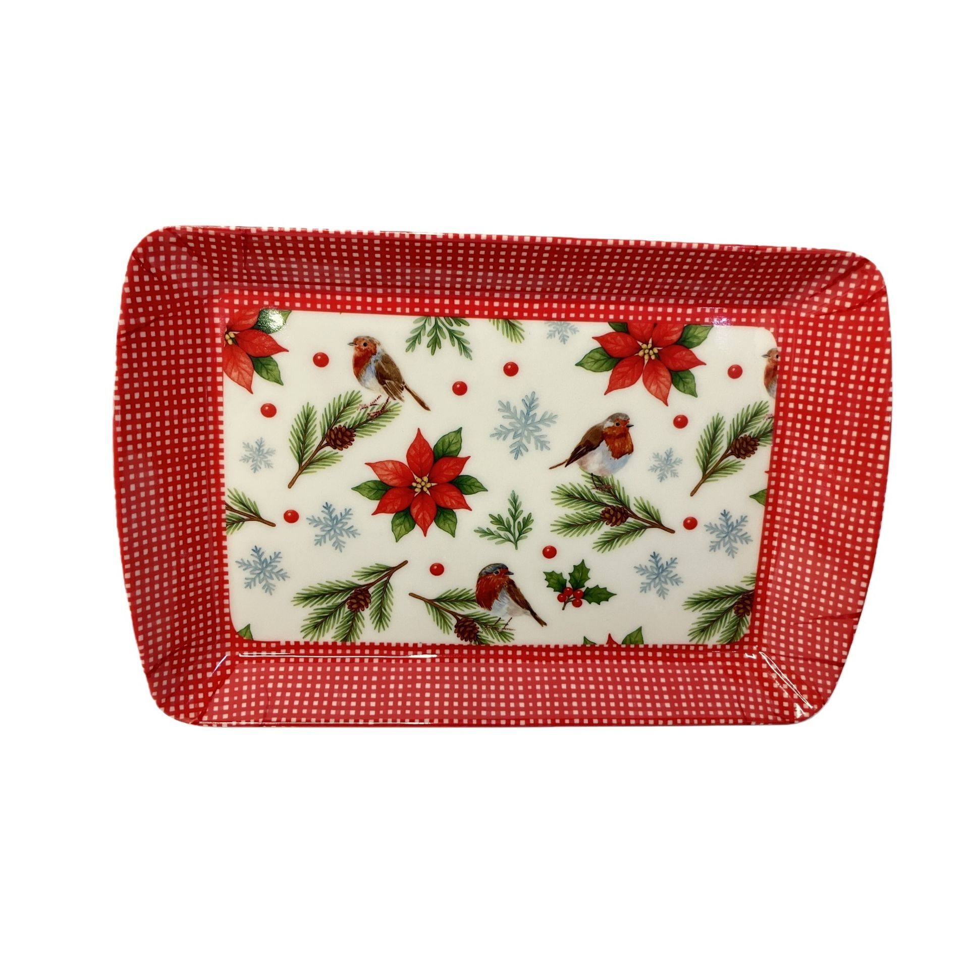 A festive platter featuring a pattern of red-breasted birds, poinsettia flowers, pine branches, and snowflakes, all framed by a red and white gingham border.