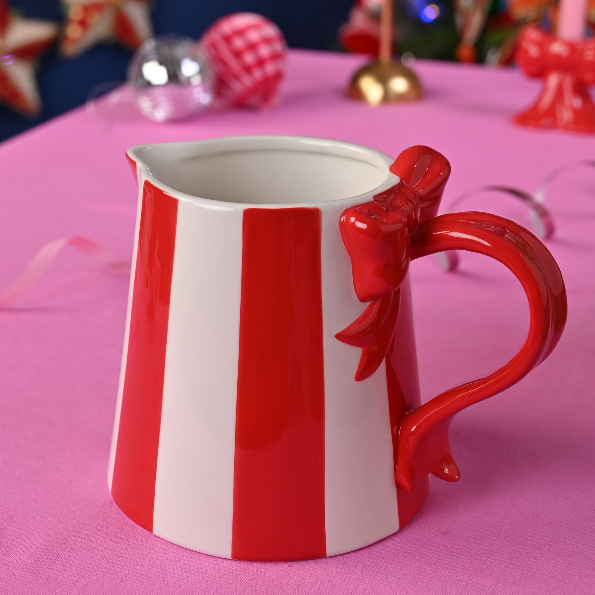 Finished in glossy red-and-white candy stripes, this ceramic jug features a curved handle and a neatly tied bow for a peppermint-sweet twist. Kitsch yet clean-lined, it captures the circus-meets-Christmas energy, making a colour-pop accent for serving, styling, or centrepieces.