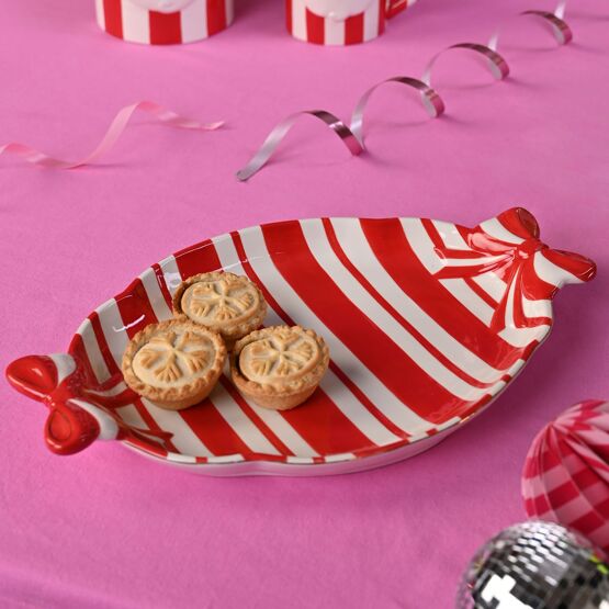 A red and white striped ceramic plate with two bows on the sides, ideal for festive nibbles. Finished with candy cane stripes and glossy bows, it mixes retro showtime flair with festive fun.