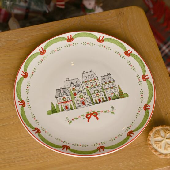 The round plate showcases a decorative border and an illustration of country cottages nestled among pine trees in a snowy landscape. Generously sized for main courses and hearty festive meals, it blends timeless winter imagery with a modern, versatile design.